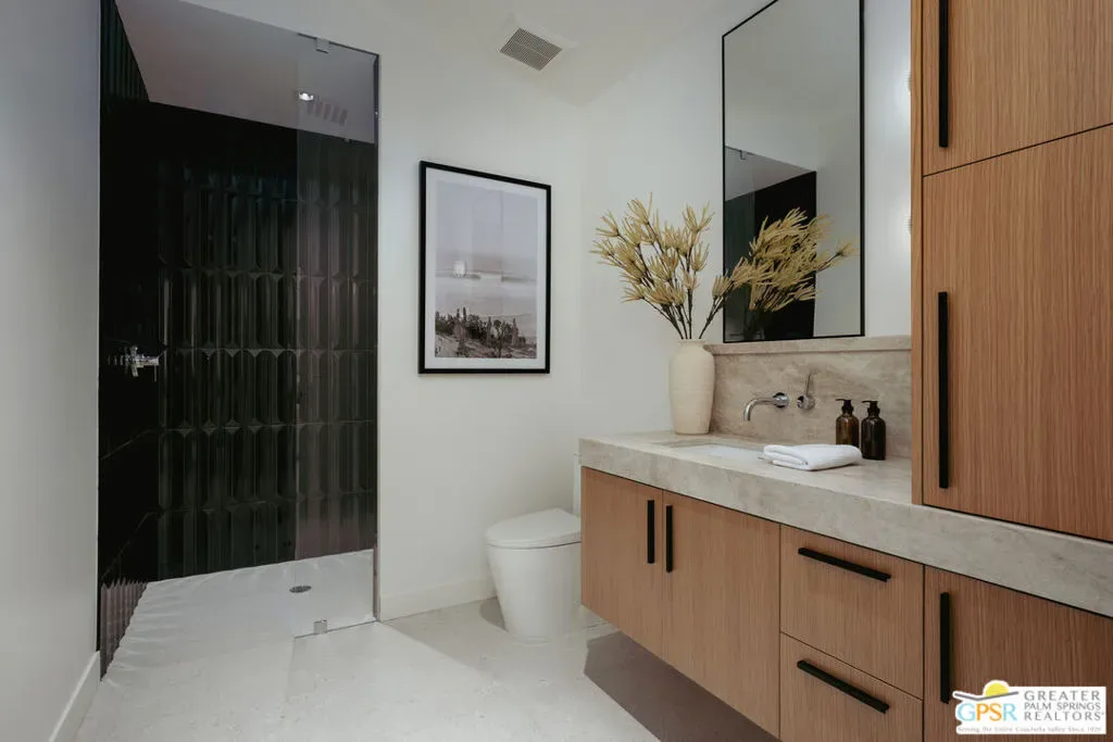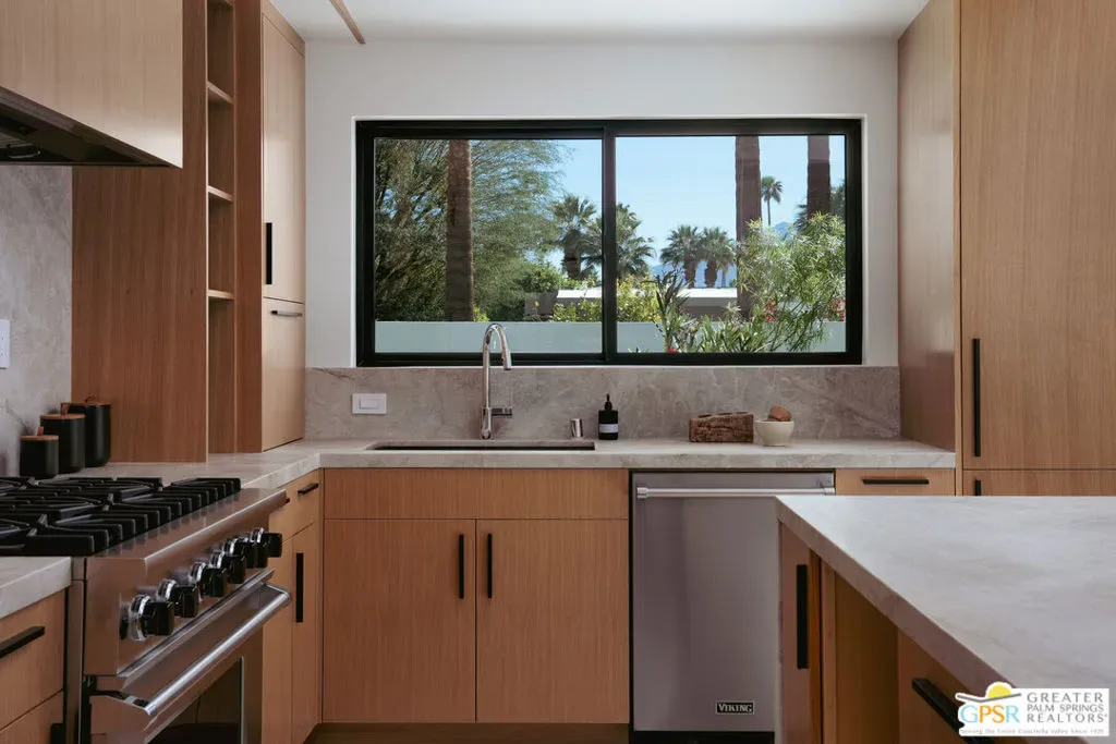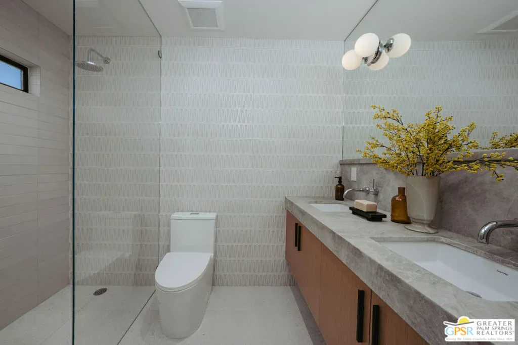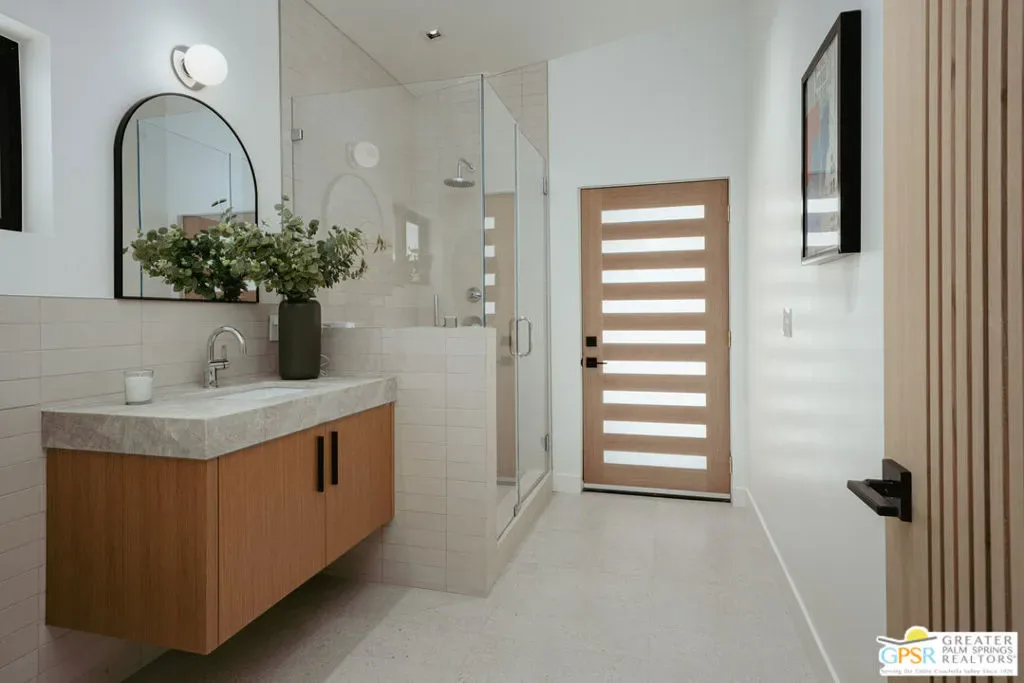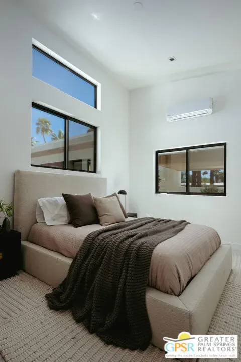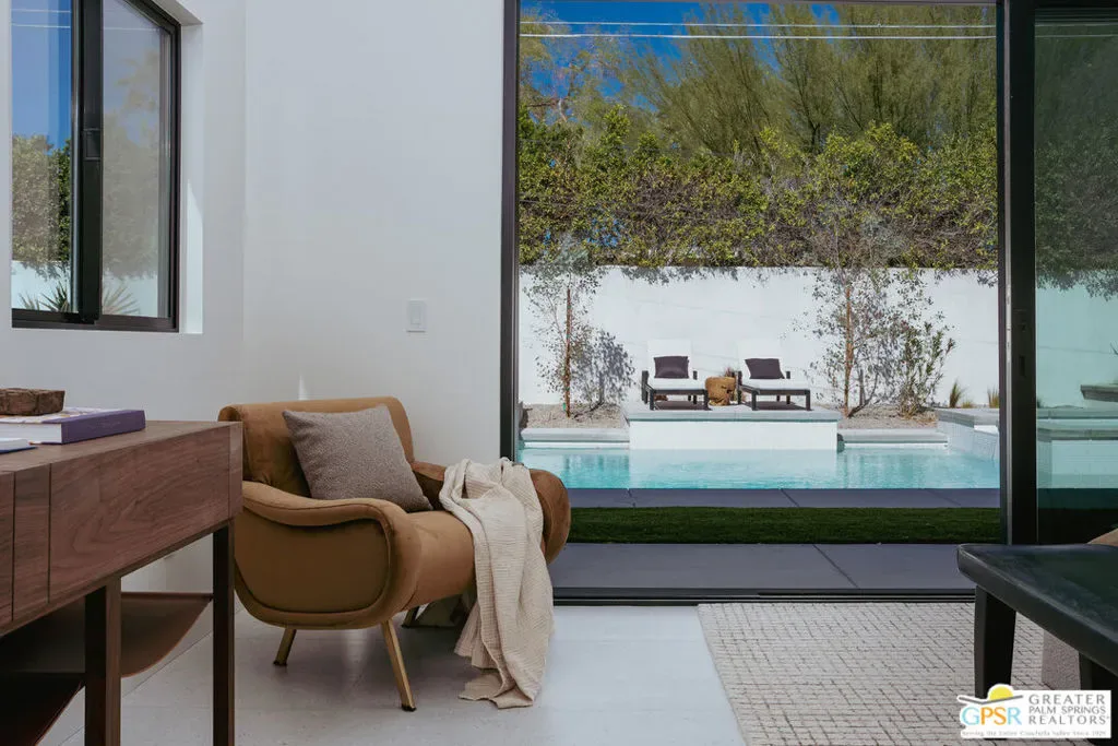 Originally built in 1957 and completely reimagined for modern living, this striking Sunrise Park residence offers the rare opportunity to enjoy the architectural spirit of mid-century Palm Springs with the confidence of new construction. Taken down to the studs and extensively redesigned, the home features soaring 12-foot vaulted ceilings, expansive walls of glass, and a seamless indoor-outdoor flow that frames dramatic mountain views. The 3-bedroom, 3-bathroom main residence is complemented by a beautifully appointed detached casita offering 2 bedrooms, 1 bath, and its own living space ideal for guests and family, or premium short-term rental flexibility. Every system has been rebuilt or replaced, including plumbing, electrical, gas lines, HVAC, roof, windows, and doors. Interiors balance warm natural materials with clean architectural lines, creating spaces that feel comfortably chic and effortlessly livable. Fully walled and gated, the outdoor living spaces are anchored by a newly constructed resort-style pool and spa, lounging platforms, and multiple outdoor entertaining areas designed to create a compound-like feel. With 2,630 square feet of living space in one of central Palm Springs’ most desirable neighborhoods and full short-term rental eligibility this home offers exceptional flexibility as a private retreat, luxury second home, or high-performing investment property.