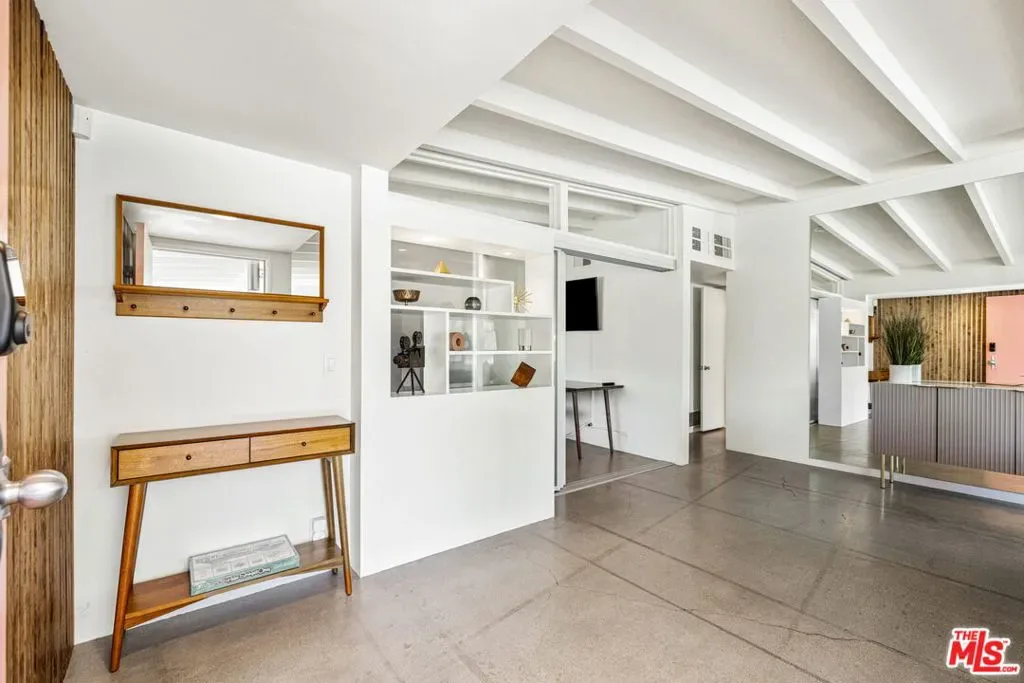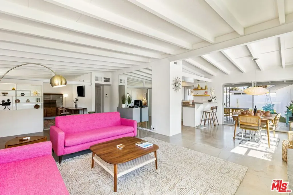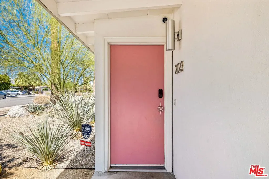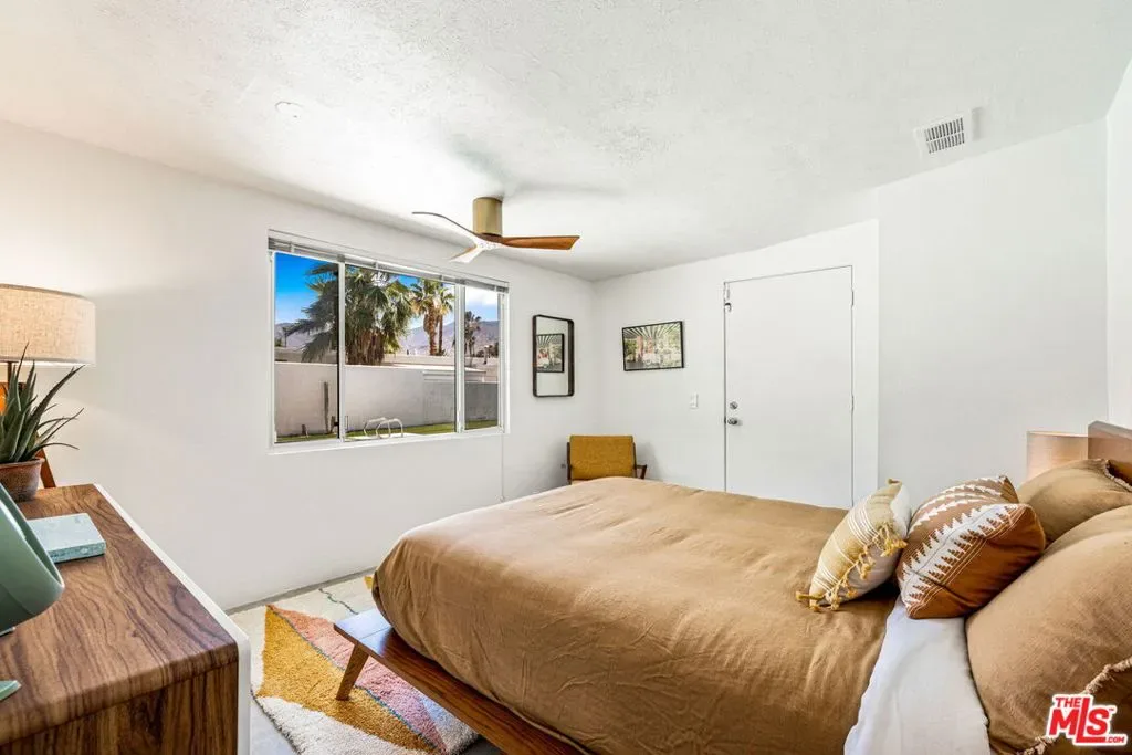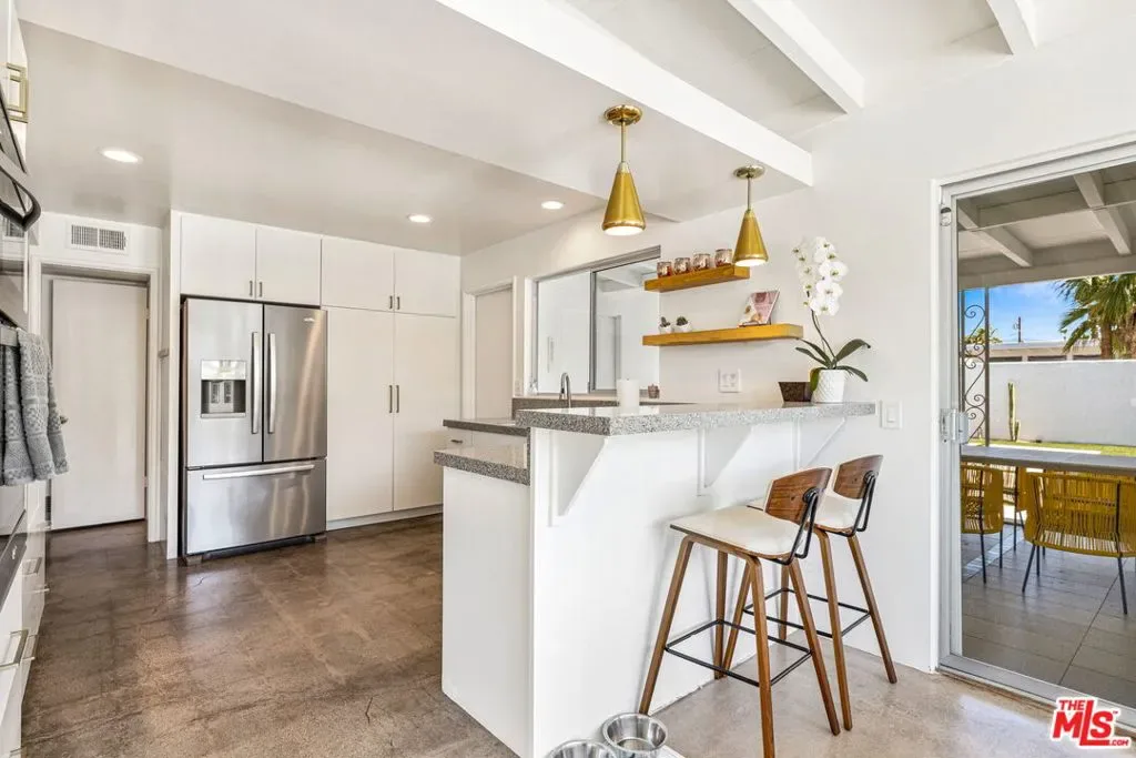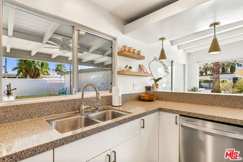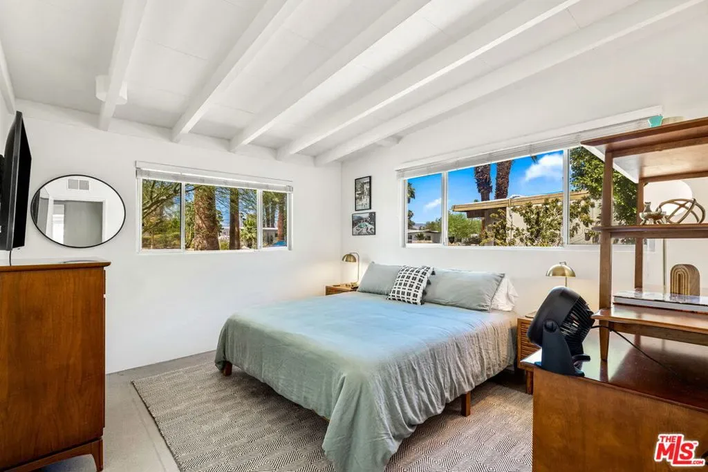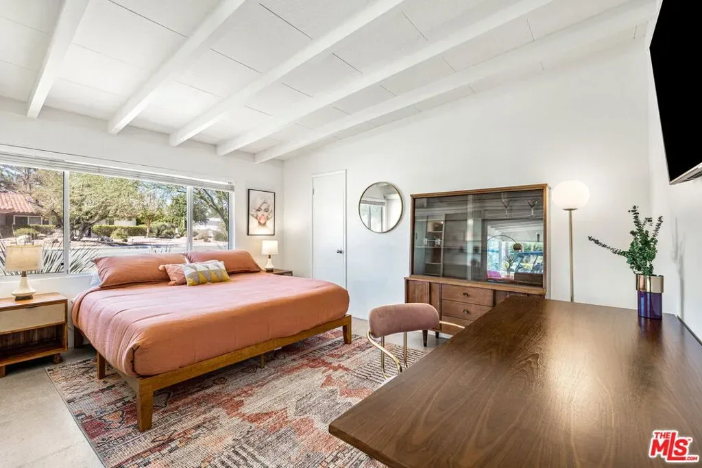 Located in the highly sought-after Sunrise Park neighborhood of Palm Springs, this authentic Mid-Century Modern home sits on an oversized corner lot with a dramatic circular driveway, offering rare curb appeal, privacy, and abundant parking. Iconic architectural details define the interior, including soaring wood-beamed ceilings, polished concrete floors, and expansive walls of glass that flood the home with natural light. The open-concept layout flows seamlessly to the backyard, where west-facing San Jacinto Mountain views create stunning sunset backdrops. A statement fireplace with a reclaimed wood mantle adds warmth and character. In addition to three bedrooms, a spacious bonus room currently functions as a fourth bedroom, providing flexible space for guests, a home office, or media room. The fully gated backyard delivers true Palm Springs living with a saltwater pool and spa, covered patio, and low-maintenance turf landscaping. Just minutes from downtown dining, shopping, and golf, this property blends timeless Mid-Century style, lot presence, and versatility in one exceptional offering.