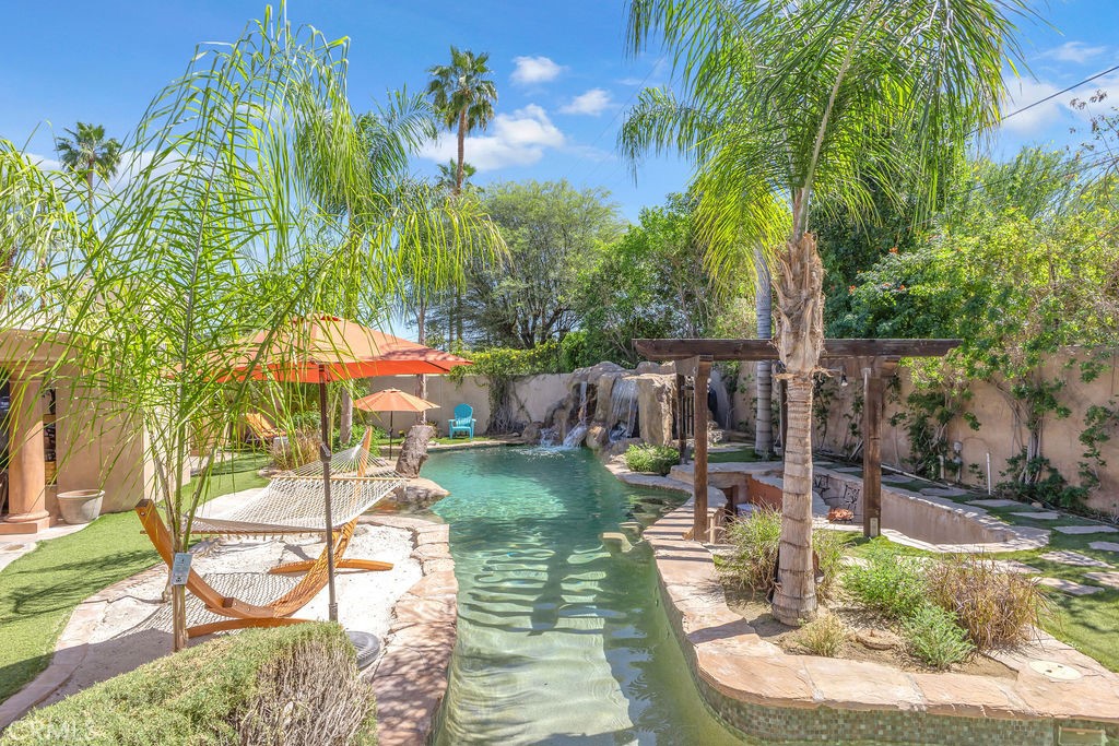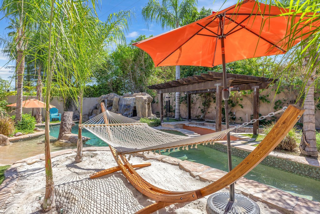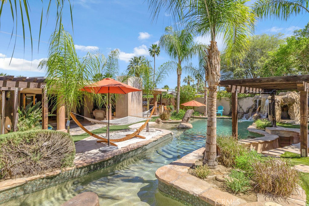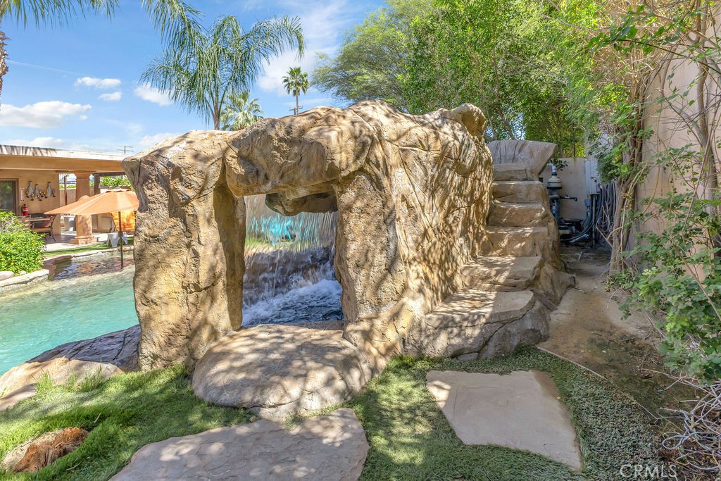 Inviting interiors feature open-concept flow, accent wood walls, spa-inspired bathrooms with freestanding tubs and rain showers, cozy bedrooms with ceiling fans and desert views, and a dedicated casita suite. Seamless indoor-outdoor connection leads to the backyard paradise: expertly custom-crafted by the owner of LA Pool & Patio, boasting a thrilling waterslide, dramatic grotto cave with hidden spa and cascading waterfall entrance, flowing lazy river, swim-up bar, overhead bridges, sauna, heated waterfall features, putting greens, lush landscaping, and a covered patio with outdoor kitchen, fireplace, and ample seating.