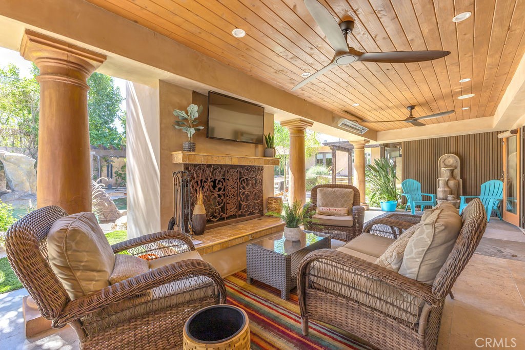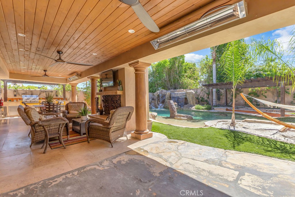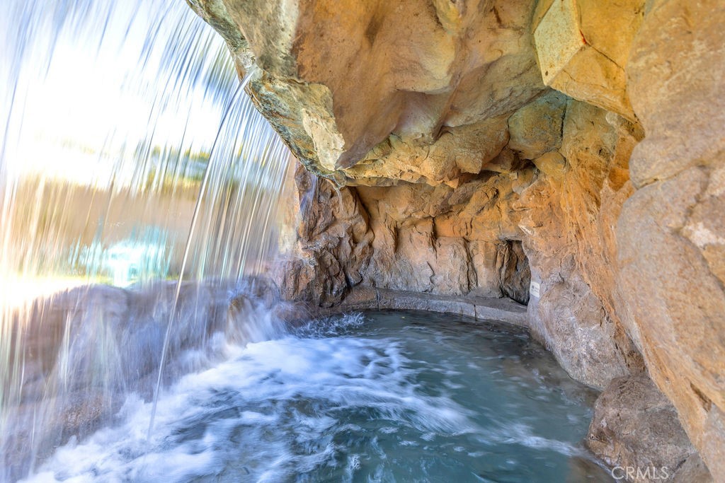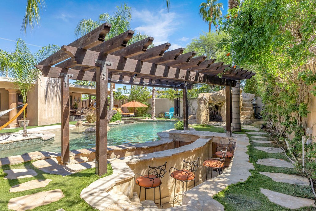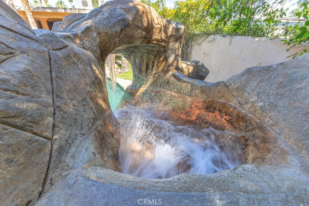 Inviting interiors feature open-concept flow, accent wood walls, spa-inspired bathrooms with freestanding tubs and rain showers, cozy bedrooms with ceiling fans and desert views, and a dedicated casita suite. Seamless indoor-outdoor connection leads to the backyard paradise: expertly custom-crafted by the owner of LA Pool & Patio, boasting a thrilling waterslide, dramatic grotto cave with hidden spa and cascading waterfall entrance, flowing lazy river, swim-up bar, overhead bridges, sauna, heated waterfall features, putting greens, lush landscaping, and a covered patio with outdoor kitchen, fireplace, and ample seating.
