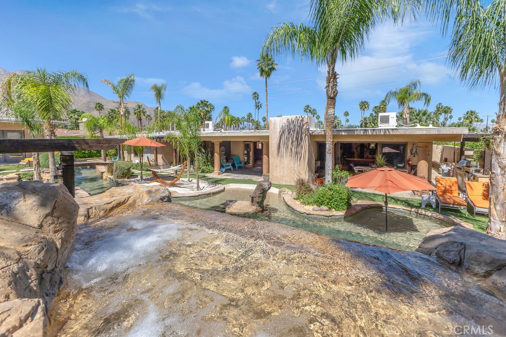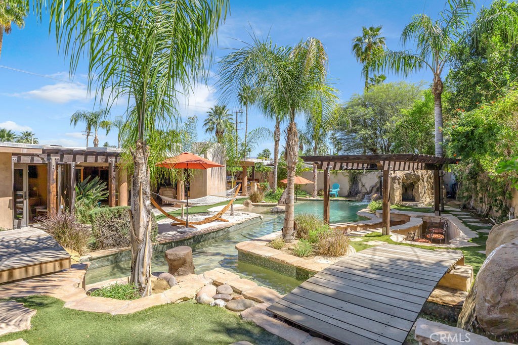 Turnkey, fully furnished mid-century modern oasis in prime Tahquitz River Estates—ready for immediate enjoyment or continued short-term rental success. This private resort-style retreat sits on a fully enclosed ¼-acre lot with custom walls maximizing every inch for privacy and entertainment. Approximately 2,226 sq ft of versatile livable space includes the original home, a 354 sq ft casita addition for guest privacy, and an expansive game room—perfect for families, groups, or luxury living.