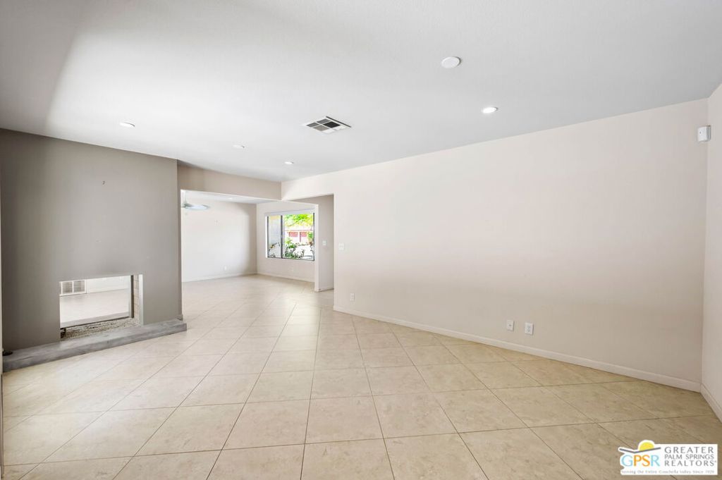 Set along the fairway on a generous, nearly quarter-acre lot, this 1965-built residence blends classic mid-century character with a fresh, modern edge. Clean lines and an open, airy layout set the tone, creating a light-filled environment that feels both relaxed and refined. French doors invite seamless indoor-outdoor living, opening to a private backyard retreat complete with pool and spa, perfect for enjoying desert sunshine and golf course views. Inside, tile flooring flows throughout, complemented by recessed lighting that enhances the home’s bright, contemporary feel. The kitchen offers both style and function with stainless steel appliances, granite countertops, and a sleek glass tile backsplash. A dual-sided fireplace anchors the living and family rooms, adding warmth and architectural interest to the central gathering spaces. Thoughtful upgrades include a tankless water heater, indoor laundry, and dual sinks in the primary suite. The guest bath makes a bold statement with its eye-catching glossy red vanity and additional storage. Outside, the low-maintenance landscaping allows you to spend more time enjoying the setting and less time maintaining it. This home is ready for its next chapter, an ideal opportunity for a buyer to move in, personalize, and make it their own piece of Palm Springs living.