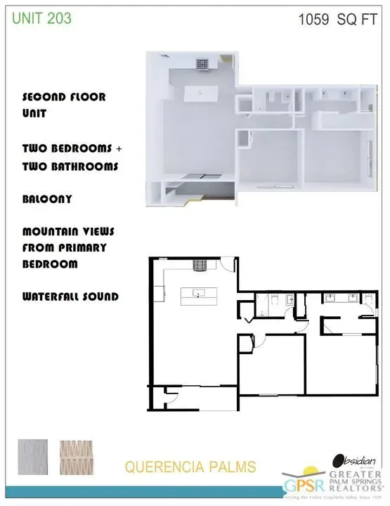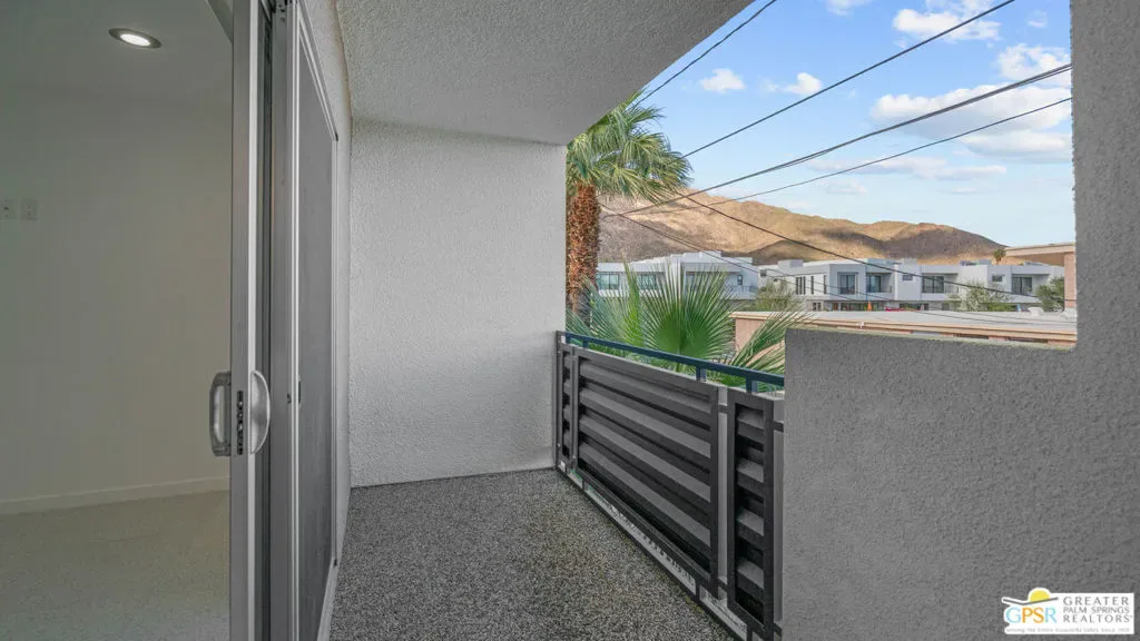Unit 203 offers a unique combination of privacy, natural light, and multi-directional views within Querencia Palms. Positioned as an upper-level corner residence, the home enjoys a bright and airy feel throughout, with a north-facing balcony that remains comfortably shaded – creating an ideal outdoor space to relax and enjoy year-round. The balcony also includes a dedicated storage closet, adding convenience and functionality to the outdoor living area. From the kitchen, south-facing windows bring in additional daylight, enhancing the overall sense of openness. The primary suite captures western mountain views from both the bedroom and bathroom, offering a daily connection to the surrounding landscape. This thoughtful orientation creates a dynamic living experience with light and views from multiple directions throughout the day. Residents enjoy access to resort-style amenities including a pool, spa, water features, koi pond, and beautifully landscaped grounds, all just minutes from Downtown Palm Springs, dining, and outdoor recreation. Offered on fee land (no land lease), this residence presents a compelling opportunity combining comfort, flexibility, and long-term value. With its functional layout and strong rental potential, this property also presents an attractive opportunity for buyers seeking a low-maintenance, income-producing residence in a high-demand Palm Springs location.