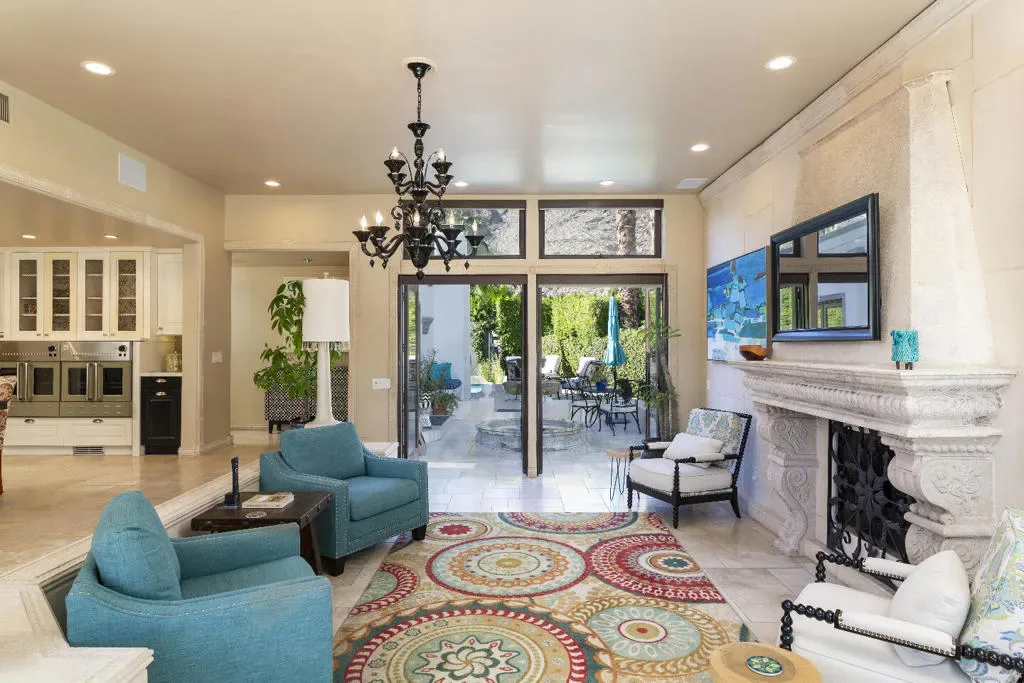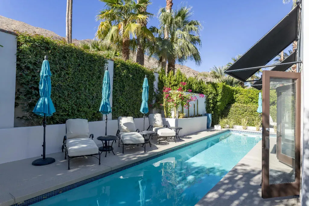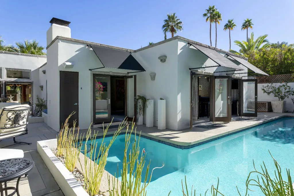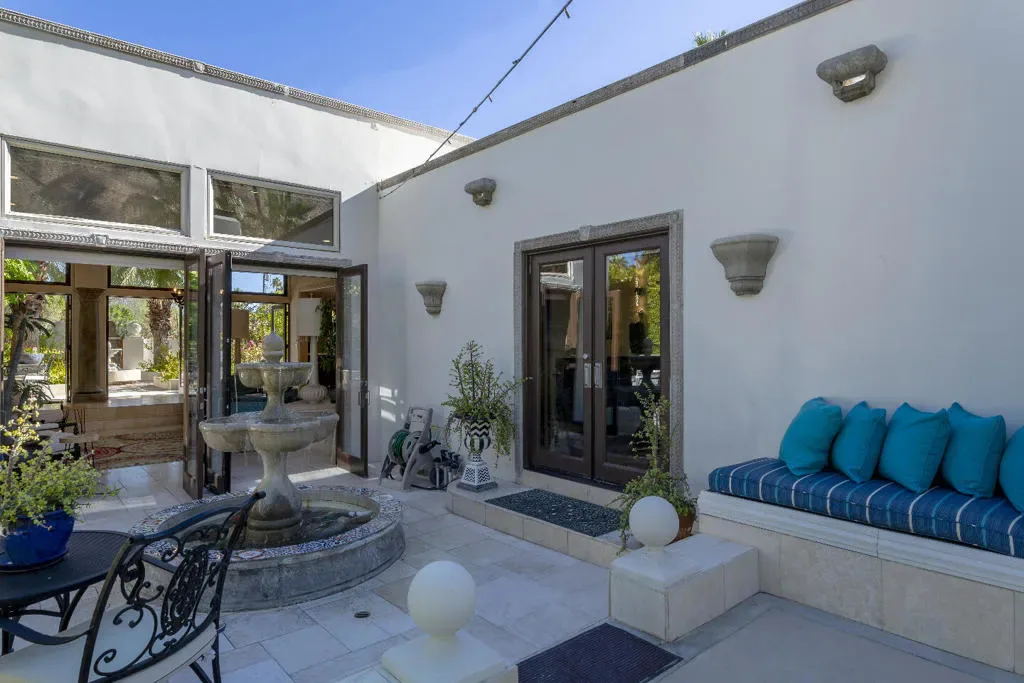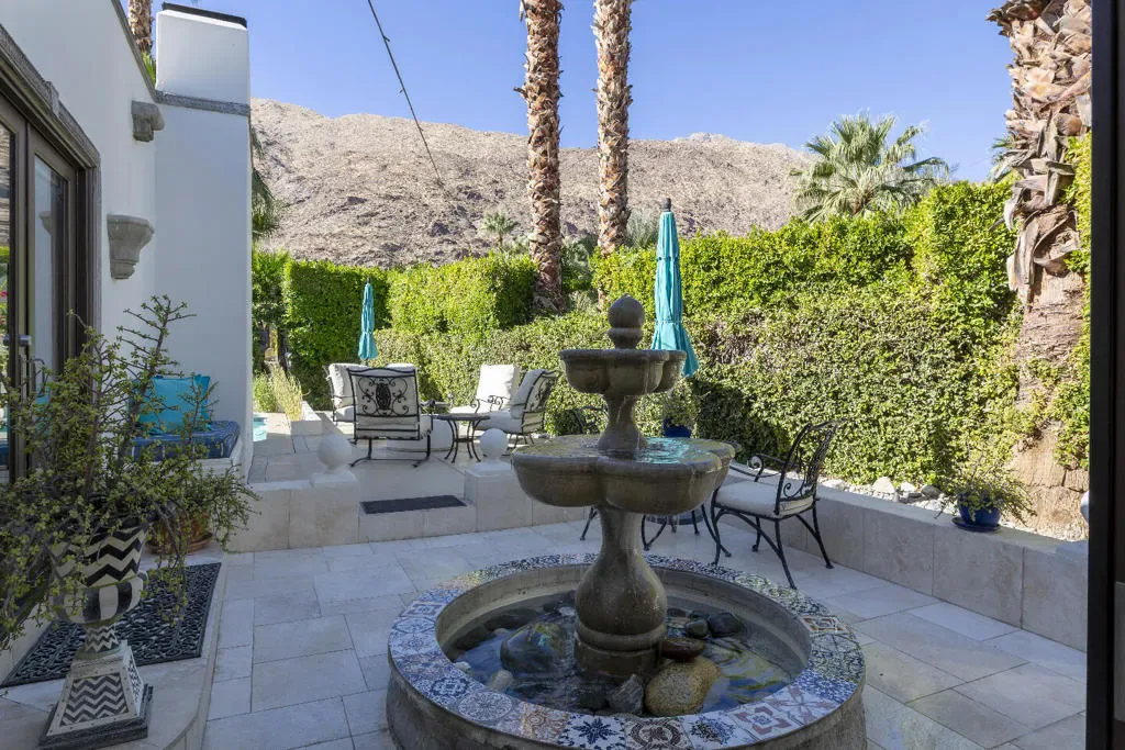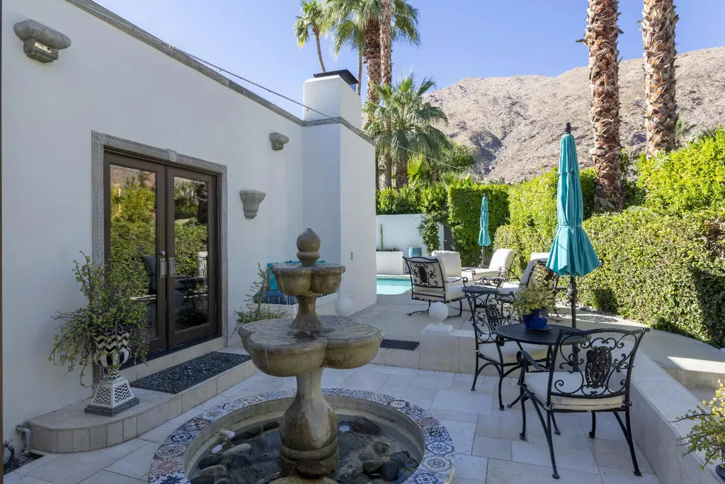This Mediterranean villa, with interior design by noted Palm Springs designer Christopher Kennedy, brings refined European elegance to the highly coveted Mesa neighborhood. From the moment you enter the palm-lined courtyard–with its trickling fountain and romantic architectural details–the home evokes the ambiance of a luxurious retreat framed by spectacular mountain views. Designed with both sophistication and livability in mind, the property features two en-suite primary bedrooms, a poolside cabana with its own bath, and an open floor plan perfectly suited for elevated Palm Springs entertaining.Through the courtyard, French doors open into a vaulted living area anchored by a sculpted stone fireplace and a dramatic black Murano glass chandelier–signature touches that highlight Kennedy’s Mediterranean inspiration. The adjacent chef’s kitchen continues this theme with European-style cabinetry, a central dining area for seamless kitchen-to-table service, and professional-grade appliances ideal for everyday cooking and hosting.The living room flows effortlessly to the resort-style backyard, where Southern European outdoor living takes center stage. A sparkling pool, multiple conversation areas, an enchanting fountain, a fire pit, and a fully equipped outdoor barbecue kitchen create a refined entertaining environment. A commercial misting system ensures comfort on warm desert days. There is also a poolside cabana with a three-quarters bath, which is currently furnished as a chic bar but could easily be converted to a petite en-suite guest quarters or office. Home offered furnished per inventory.Both primary suites offer direct pool access and beautifully curated finishes. One suite features a walk-in closet and bath that features a urinal and shower with picture window. Additional amenities include an outdoor shower, immaculate two-car garage equipped with an ice maker–perfect when entertaining–and a laundry room.Additional Items and Amenities Owned Solar | 16 panel system | installed 2023 Main HVAC systems replaced 2024 | Split system in cabana Outdoor shower Ice maker in the garage Professional grade misting system | 2024 Exterior of home freshly painted and pool decking cleaned