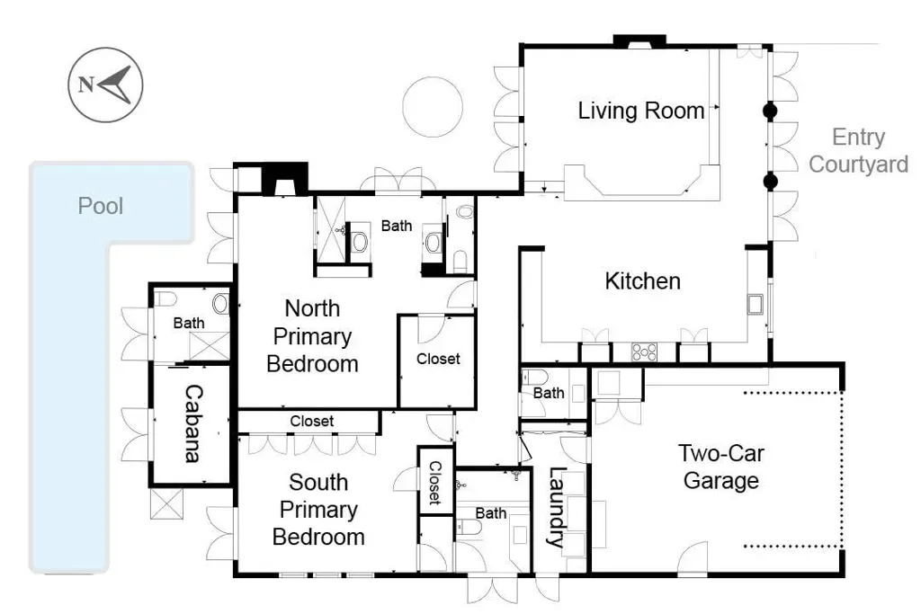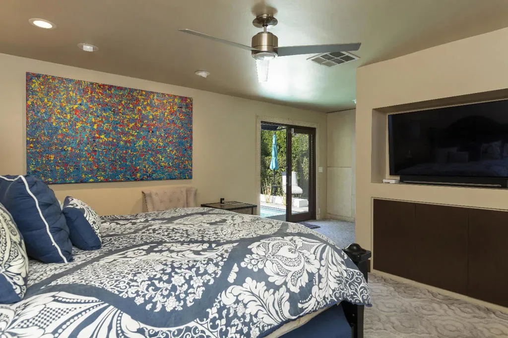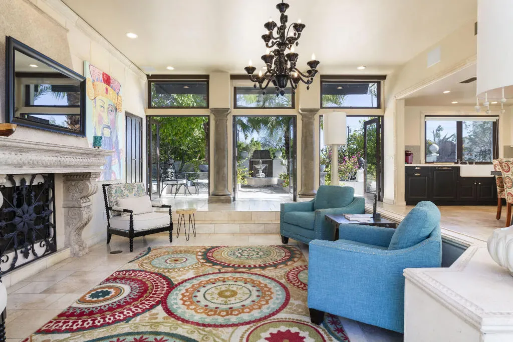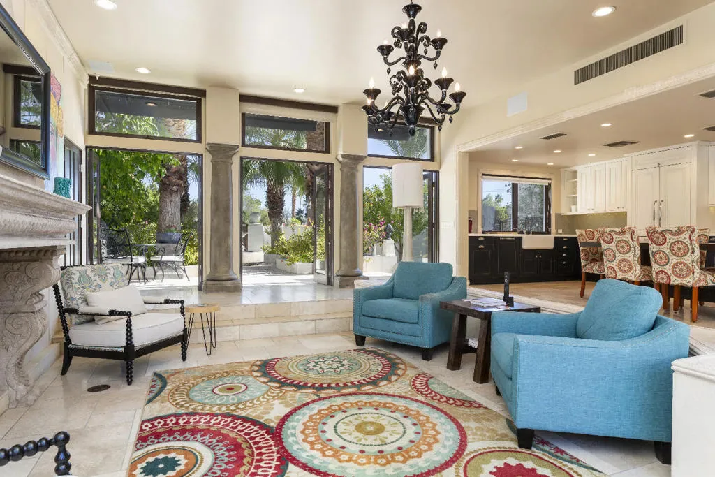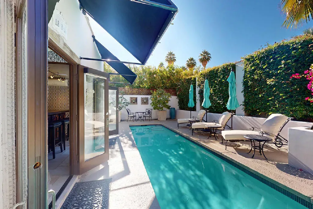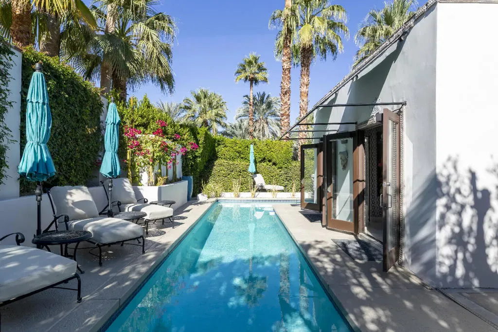 This Mediterranean villa, with interior design by noted Palm Springs designer Christopher Kennedy, brings refined European elegance to the highly coveted Mesa neighborhood. From the moment you enter the palm-lined courtyard–with its trickling fountain and romantic architectural details–the home evokes the ambiance of a luxurious retreat framed by spectacular mountain views. Designed with both sophistication and livability in mind, the property features two en-suite primary bedrooms, a poolside cabana with its own bath, and an open floor plan perfectly suited for elevated Palm Springs entertaining.Through the courtyard, French doors open into a vaulted living area anchored by a sculpted stone fireplace and a dramatic black Murano glass chandelier–signature touches that highlight Kennedy’s Mediterranean inspiration. The adjacent chef’s kitchen continues this theme with European-style cabinetry, a central dining area for seamless kitchen-to-table service, and professional-grade appliances ideal for everyday cooking and hosting.The living room flows effortlessly to the resort-style backyard, where Southern European outdoor living takes center stage. A sparkling pool, multiple conversation areas, an enchanting fountain, a fire pit, and a fully equipped outdoor barbecue kitchen create a refined entertaining environment. A commercial misting system ensures comfort on warm desert days. There is also a poolside cabana with a three-quarters bath, which is currently furnished as a chic bar but could easily be converted to a petite en-suite guest quarters or office. Home offered furnished per inventory.Both primary suites offer direct pool access and beautifully curated finishes. One suite features a walk-in closet and bath that features a urinal and shower with picture window. Additional amenities include an outdoor shower, immaculate two-car garage equipped with an ice maker–perfect when entertaining–and a laundry room.Additional Items and Amenities Owned Solar | 16 panel system | installed 2023 Main HVAC systems replaced 2024 | Split system in cabana Outdoor shower Ice maker in the garage Professional grade misting system | 2024 Exterior of home freshly painted and pool decking cleaned