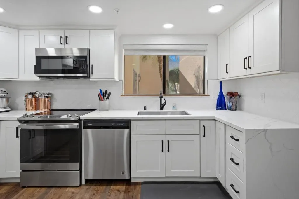 *** Single floor home, no stairs *** Experience resort-style living at The Pointe, a premier gated community in South Palm Springs. This beautifully renovated 2-bedroom, 2-bathroom home combines modern updates with breathtaking western views of the San Jacinto Mountains. Situated on fee simple land (you own the land), this move-in-ready retreat offers the perfect blend of luxury and location. The light-filled living space is designed for style and comfort. The interior features luxury vinyl plank flooring throughout–durable, stylish, and completely carpet-free. The inviting living room is anchored by a cozy gas fireplace and accented with recessed lighting, elegant crown molding, and custom plantation shutters. All sliding glass doors are new, ensuring energy efficiency and seamless indoor-outdoor flow. The updated kitchen is a chef’s delight, showcasing quartz countertops, stainless steel appliances, upgraded cabinetry with under-cabinet lighting, a dedicated wine refrigerator, and a convenient beverage/coffee nook. The spacious primary suite serves as a peaceful sanctuary, featuring a fully remodeled ensuite bathroom with a grout-free shower and a mid-century modern vanity. The second bedroom is ideal for guests or a professional home office. Storage is abundant throughout the home, including newly added custom cabinetry in the laundry room. Enjoy the desert climate in your private courtyard, featuring a slatted roof that provides the perfect balance of sun and shade for morning coffee or evening cocktails. A natural gas grill is included, making outdoor entertaining effortless. HOA dues cover the building exterior, roof, trash, and earthquake insurance. Resort amenities include access to tennis and pickleball courts, and an expansive pool & spa, all set among lush landscaping and towering palms. The Pointe is a well-managed, quiet complex where the majority of residents are seasonal or part-time owners. Located just minutes from downtown Palm Springs, you are steps away from world-class dining and entertainment. This home is also conveniently located near Smoke Tree shops and services for everyday essentials. With a brand-new HVAC system and fresh interior paint, and spacious 2 car garage, this condo is a rare find in a sought-after South Palm Springs enclave.