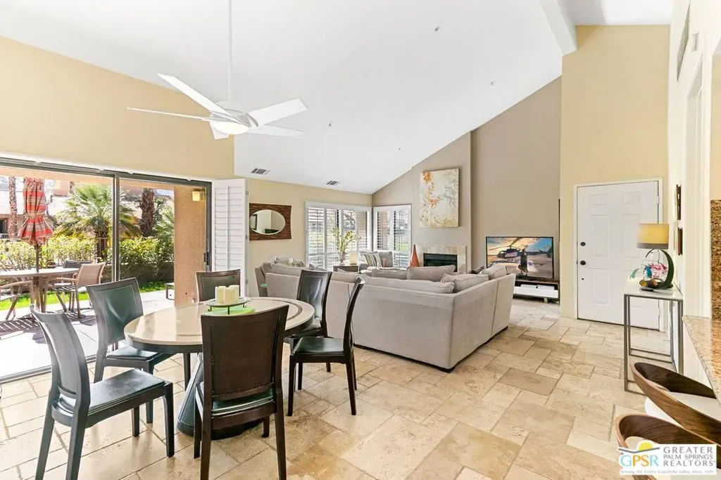 Welcome to The Pointe in desirable South Palm Springs. Owner prefers a long-term tenant with a minimum 6-month lease, ideally 12-months. This stunning single-level architectural condominium offers 3 bedrooms plus a versatile office/den, highlighted by dramatic soaring vaulted ceilings and elegant travertine tile flooring throughout. Offered fully furnished, per inventory. The updated chef’s kitchen features granite countertops, a Viking range, and abundant storage, perfect for everyday living and entertaining. The light-filled living room showcases a striking fireplace and seamless indoor-outdoor flow. Step outside to a patio overlooking the pool, offering panoramic South and West mountain views ideal for relaxing or entertaining. A second, private covered internal patio off the primary suite provides a retreat. Two recently updated bathrooms enhance comfort and style. Additional features include a two-car attached garage with direct interior access and close proximity to the community’s resort-style pool, spa, and tennis courts. Enjoy a third patio located off the third bedroom currently being used as a den. Conveniently located near shopping, dining, banks, the post office, and just minutes from vibrant downtown Palm Springs.