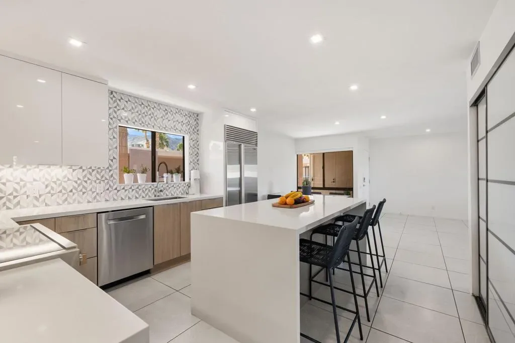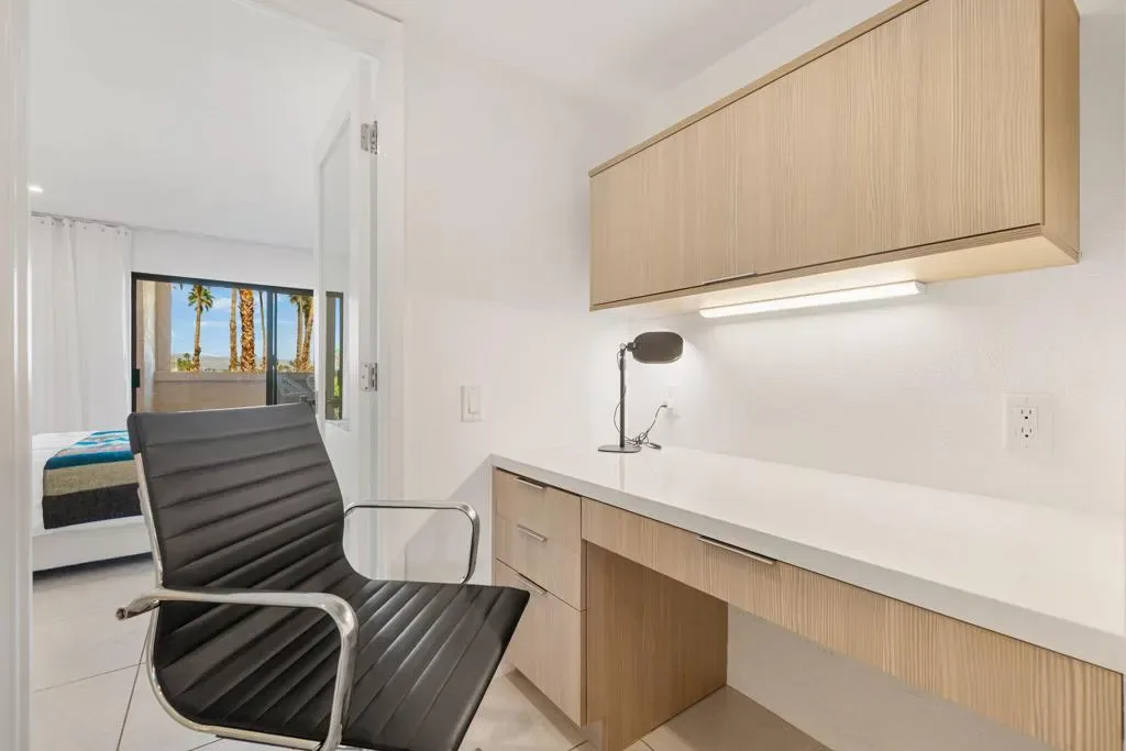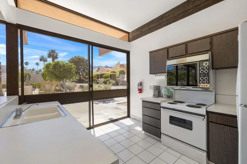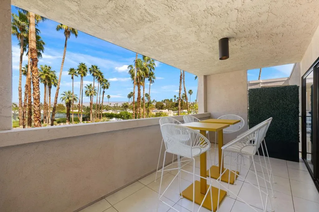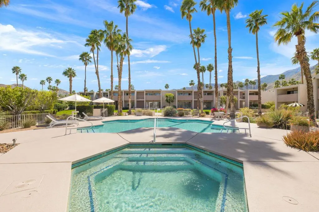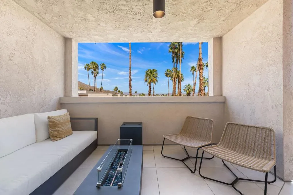 Vaulting mounts surround our beautiful valley. The Santa Rosas to the southwest, San Jacinto to our west, and the Little San Bernardinos to the north are like a movie screen. Light and shadow dance upon them through the day. With our flat valley and ubiquitous ‘patio homes,’ it’s rare for a condominium to come to market that offers a bird’s-eye view of any of these incredible mountain ranges. By rising just one flight of stairs, you shift perspective. The world unfolds below you. Distance through glass becomes your artwork. Privacy is a given. This is what 2696 S. Sierra Madre Unit F14 offers in a clean, contemporary envelope. Designed amidst a park-like setting with streams, bridges, pools, and ball courts by famed architect Don Wexler, Twin Springs is an ”it” development few even know exists. So unique, it was included in the 2025 Modernism Week under the title ”Hidden Gem.” Within Wexler’s vernacular, Twin Springs is bold. Sagewood, to the north, consists of common, one-story homes. The Rose Garden in Central Palm Springs includes townhouses. And then there is Twin Springs, with upper- and lower-level homes that feel as right today as they did in 1973 when new. In fact, this home has been so thoroughly updated to meet today’s lifestyle that it’s safe to say it’s an improvement over the original. A modern, open kitchen incorporates the dining and living areas in a clean, white palette. Wine storage, a pantry, and an induction stove round out a suite of state-of-the-art appliances that complement any chef. A built-in workstation neatly tucked into an alcove makes dedicated desk work easy. Hidden in-unit laundry is a must-have for any modern home. The complex includes tennis courts, pickleball courts, a clubhouse with dry saunas in the men’s and women’s rooms, two pools, and two spas. From the long, wide balcony, you look upon the enchanting grounds, including the one-of-a-kind geometric pool composed of hexagonal segments. To the left rise the San Jacinto range, and in the distance, the mesmerizing Little San Bernardinos and endless sky. Who wouldn’t want to call this paradise home?