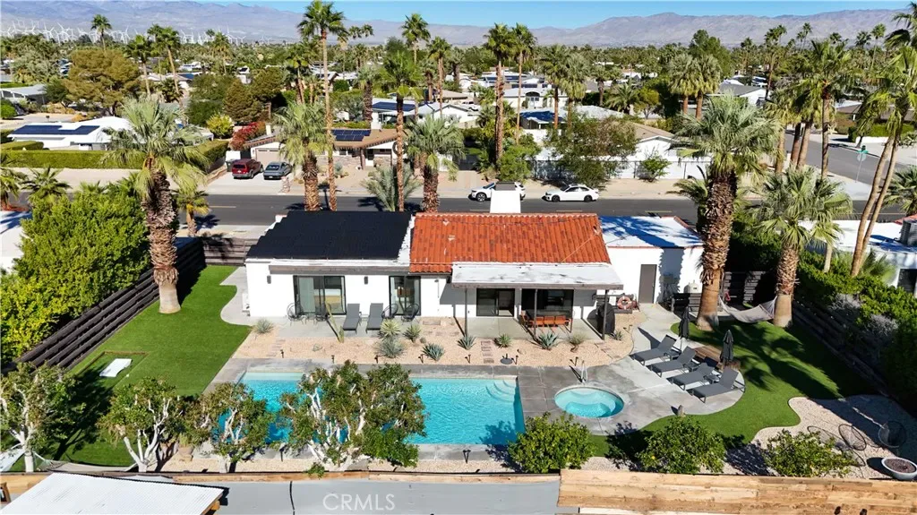 Iconic Palm Springs–style living with breathtaking, unobstructed mountain views—and a proven, highly successful short-term rental that comes furnished. This striking 3-bedroom, 2-bath modern desert retreat is thoughtfully designed to blur the line between indoor and outdoor living, making it equally compelling as a turnkey investment or effortless second home. Polished concrete floors anchor the home’s clean architectural lines, while expansive sightlines showcase dramatic mountain views from nearly every space.