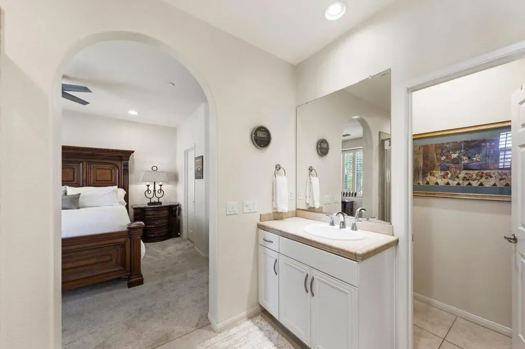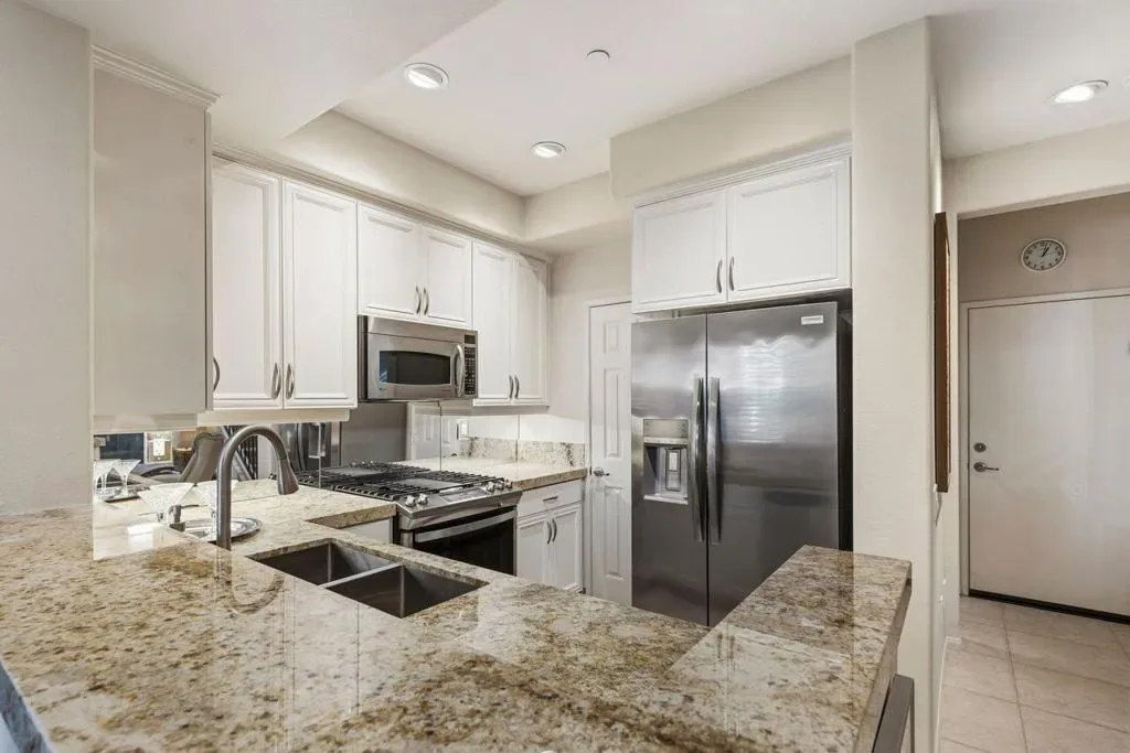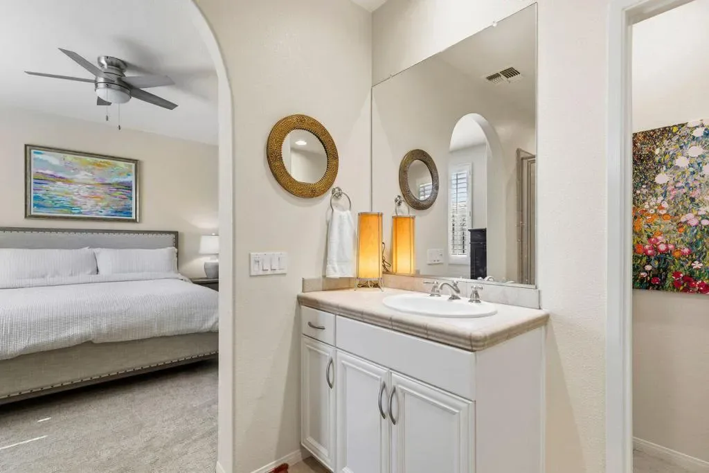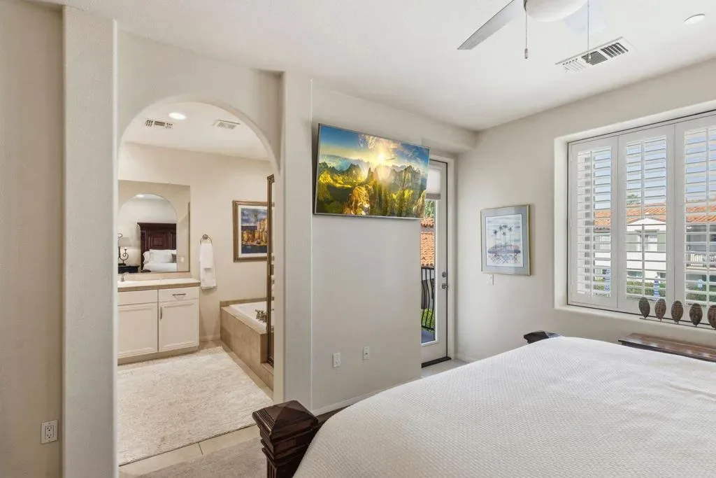 Enjoy a beautiful mountain view from this furnished condo, in a gated community with a gym. pool, spa & barbecue grills. Located close to downtown Palm Springs, it is only a 4 minute drive or one mile walk. Within the last two years condo has been painted, kitchen granite, mirrored walls, carpet, stove, refrigerator, televisions, toilets and plumbing valves have been updated. The 2-car garage is equipped with cabinetry and has direct access to condo. Two Primary Bedrooms with full baths that both offer double sinks.