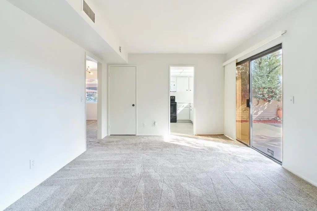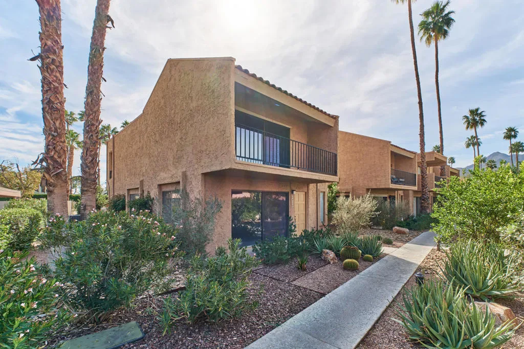 .Charming stand-alone townhome located in the quiet, private community of Villa de las Flores, surrounded by the Tahquitz Creek Golf Course. Unlike most units, this home has no shared walls, offering added privacy and a true single home feel.The upstairs features two oversized bedrooms, each with its own private balcony. Downstairs included a den that can easily serve as a third bedroom, office, or flex space. Enjoy a spacious outdoor patio, perfect for relaxing or entertaining.Recent updates include fresh interior paint, newer carpet and flooring throughout, and a newer A/C and heating system. In-unit laundry adds everyday convenience.Community amenities include multiple pools and spas, tennis and pickleball courts, and a fitness center. Move-in ready and well maintained.