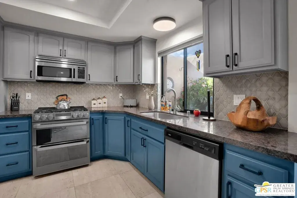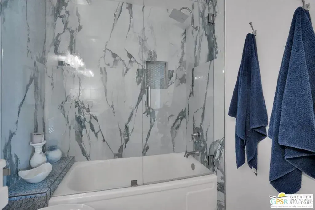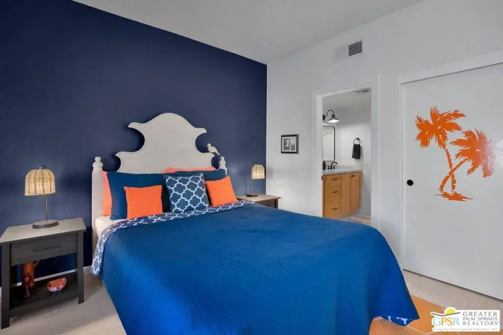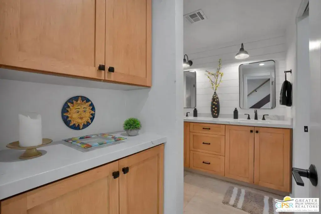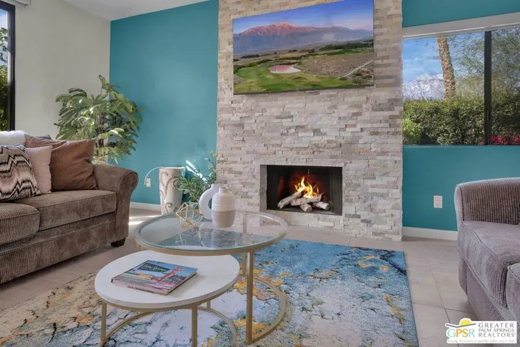 Experience resort-style living in the South Palm Springs community of Waverly Park, ideally situated on fee simple land. Step inside to find elegant porcelain tile flooring spanning the entire first floor, complemented by a stunning wooden staircase leading to the upper level. The inviting living area showcases a stacked stone gas fireplace, creating a warm focal point for relaxing evenings. Enjoy seamless indoor-outdoor living with a large, private enclosed courtyard off the living areas. The kitchen is both stylish and functional, featuring two-tone cabinetry, granite countertops, a ceramic tile backsplash, stainless steel appliances and a single-basin stainless steel sink. The spacious downstairs bedroom features an en-suite bathroom that has been completely remodeled with custom cabinetry, quartz countertops, shiplap accent backsplash, and frameless shower door with custom ceramic tile enclosure. Upstairs, the expansive primary bedroom features luxury vinyl flooring for a warm and modern touch. The primary bath has also been tastefully updated and features quartz countertops, a frameless shower door, a large soaking tub, and elegant ceramic tile finishes. The rooftop patio off the primary suite offers an additional private outdoor retreat featuring stunning San Jacinto Mountain views. Additional highlights include direct access to a two-car garage with insulated garage door panels, gas or electric dryer hookups, and newer window treatments throughout. Residents enjoy outstanding community amenities including two tennis courts, two pickleball courts, three pools, and three hot tubs. HOA dues cover water and trash, exterior stucco and roof maintenance, as well as upkeep of the common areas.