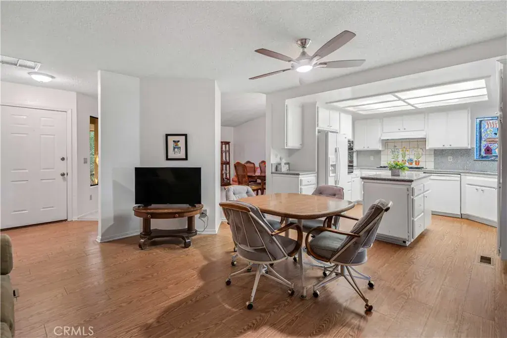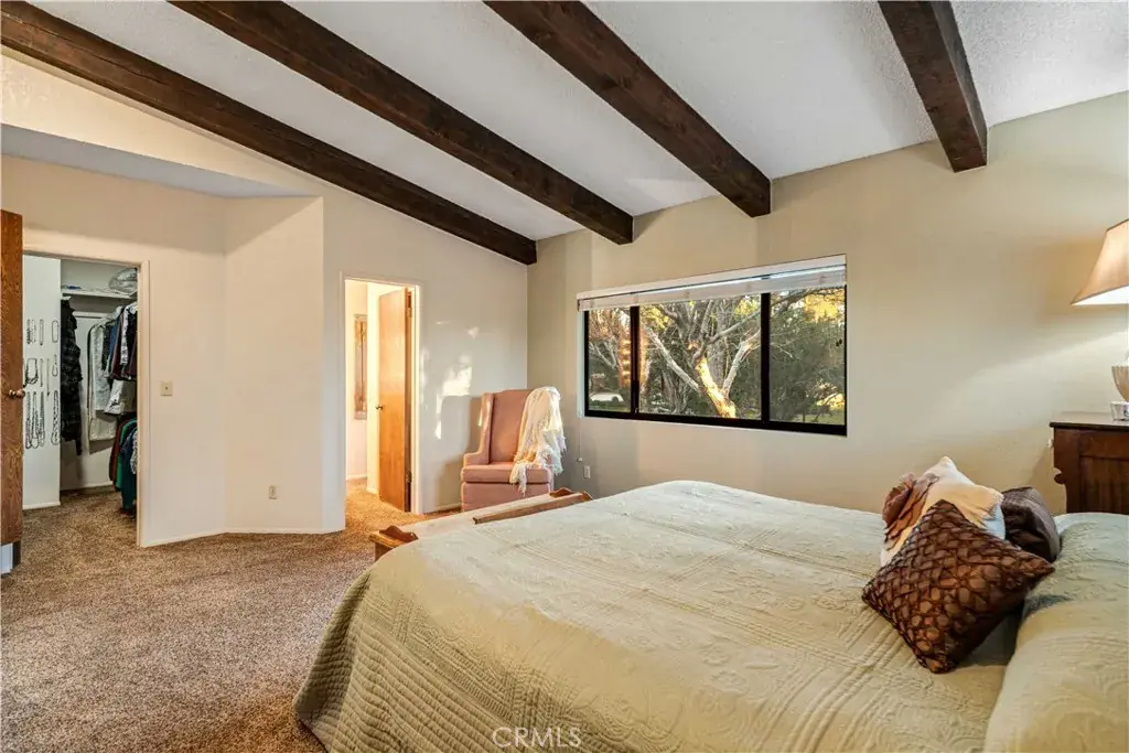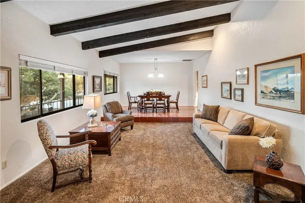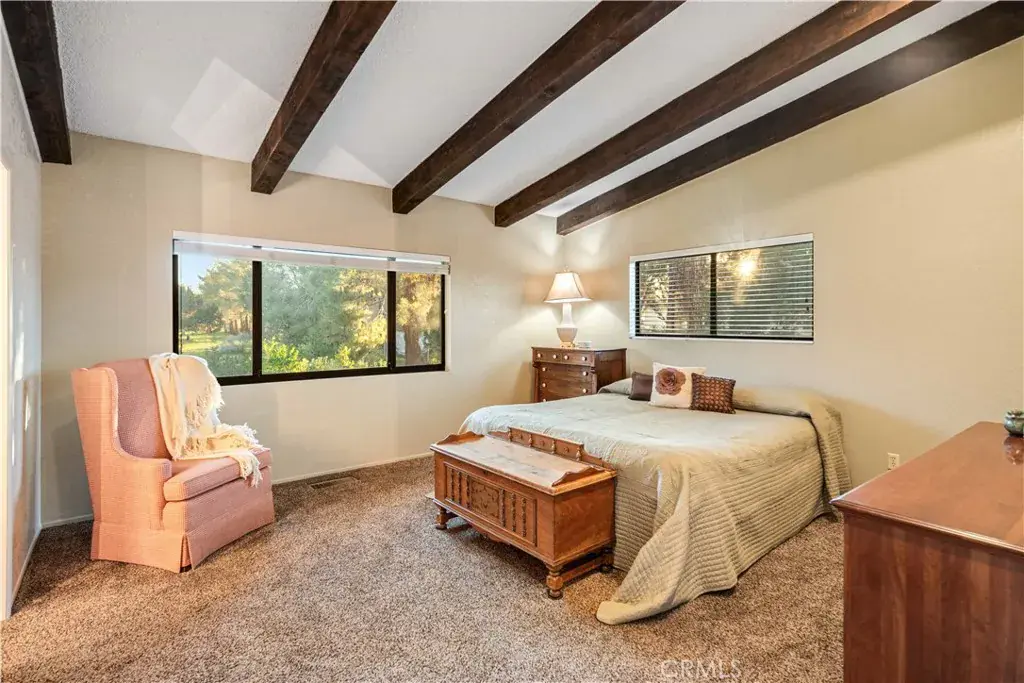 The second residence, approximately 1,500 sq ft, includes 2 bedrooms, 2 bathrooms, and an attached oversized two-car garage (32′ x 25′). This home features a kitchen with granite countertops and a center island, formal living and dining areas, a cozy wood-burning stove in the family room, private laundry, and two generously sized bedrooms with expansive bathrooms, offering comfort and independence.
