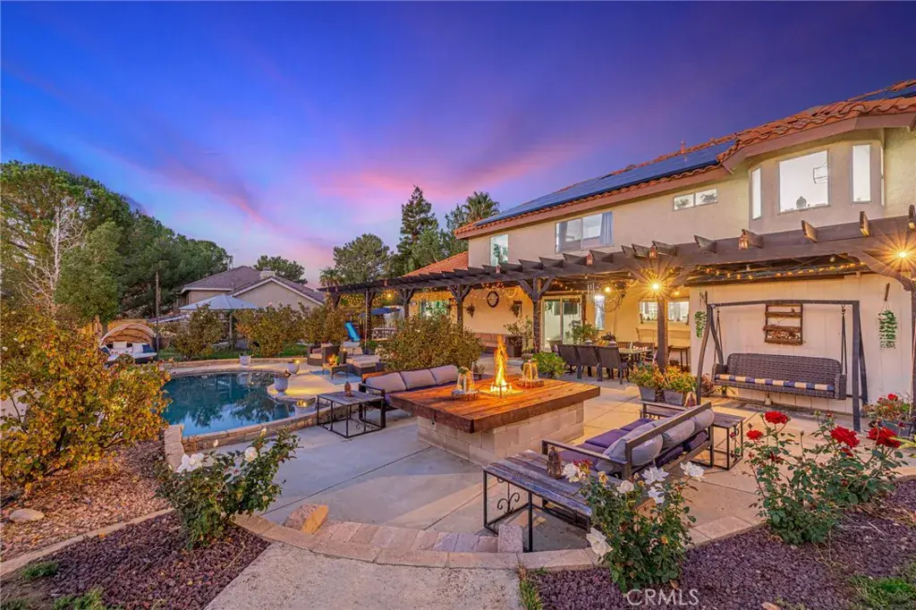 Welcome to a residence where elegance, efficiency, and entertainment unite in one stunning property. Nestled in the prestigious West Palmdale/Quartz Hill area, this luxury estate offers 4 bedrooms, 3 full baths, and 3,218 sq. ft. of refined living space, plus an additional 200 sq. ft. office/flex room not included in the total. Office upstairs can double as 5th bedroom(by adding a closet), provides versatile options for work or leisure. Set on a beautifully landscaped 21,212 sq. ft. lot, this home is designed for resort-style living. Enjoy a Pebble Tec pool and spa, 8-person sauna, covered patio, and multiple outdoor spaces for dining, games, and relaxation under breathtaking sunsets. 46 owned solar panels with two backup batteries, Tesla app integration, and a smart thermostat system for HVAC and irrigation ensure modern energy efficiency and comfort. Through elegant double doors, you’re greeted by a grand staircase, chandelier, and bright open floor plan. The formal living (with sliding doors to the backyard) and dining rooms, feature engineered plank flooring, and exquisite architectural details throughout. A downstairs guest suite with nearby full bath offers privacy and flexibility. The primary retreat features a cozy fireplace in the blt-in cabinet (which stays), spa-inspired bath with soaking tub, separate shower, and dual sinks. Upstairs includes additional bedrooms plus a flex space perfect for an office or studio. The gourmet kitchen includes newer stainless appliances (refrigerator incl.), and the laundry room has a built-in desk. A two-car garage provides ample storage and access to the bonus office/fitness room. Surrounded by roses, palm, pomegranate, fig, and apple trees, custom lighting, and multiple entertaining zones, this estate offers a rare blend of luxury, sustainability, and sophistication—a true sanctuary close to top-rated schools, parks, and shopping.