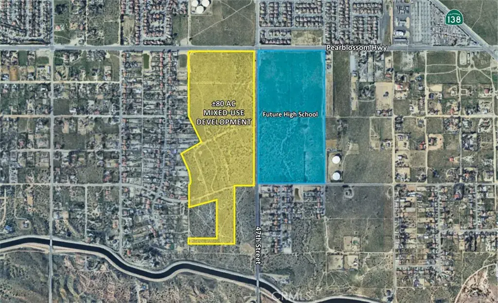 The subject property consists of approximately 80 acres located on the southwest corner of Pearblossom Highway and 47th E Street in Palmdale, California. The property is located in Los Angeles County a part of the Antelope Valley Plan and is relatively flat in topography with significant frontage on 47th St E as well as Pearblossom Hwy. Adjacent to the property’s easterly border is property owned by Antelope Valley Union High School District with plans for future high school. To the south of the property is vacant land, to the west there is an existing residential community, and to the north there is a vacant parcel as well as several medium density residential communities. The property is zoned MXD – RU (Rural Mixed Use Development Zone) with a MU-R (Mixed Use-Rural) land use designation which allows for a wide range of potential uses. The property has a recently expired Tentative Map for a large scale mixed use project. Current zoning will allow for the development of various residential product types with a maximum density of up to 5 DU/AC.