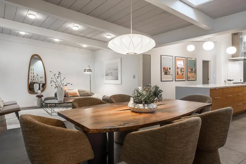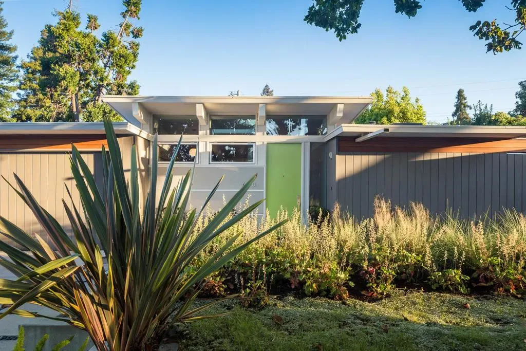 This original Joseph Eichler home has been transformed by KC Cullen Design for Living and featured on a Modern Homes Tour. Classic Eichler hallmarks remain intact: beamed and paneled vaulted ceilings, clerestory windows, radiant-heated floors, and expansive walls of glass. The open living and dining area extends across a wall of floor-to-ceiling glass with sliding doors to the rear yard for seamless indoor-outdoor living. The reimagined kitchen features bamboo cabinetry and quartz counters with waterfall peninsula seating. White globe pendants and skylights fill the home with natural light. A separate family/media room with surround sound also opens to the rear yard. The extra-spacious floor plan has 4 bedrooms and 3 full baths, including a primary suite with yard access and a privately located suite just off the foyer with outside entrance ideal for guests or office use. Radiant floor heating and multiple mini-split HVAC systems provide modern comfort. Rear yard with deck, fire pit, patio, and lawn, plus an attached 2-car garage with outside EV charging. Excellent Green Gables location near Stanford University, University Avenue shops and restaurants, and Palo Alto schools.