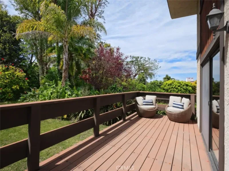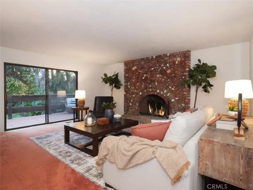 A half-flight down leads to the Living Room with a Fireplace and soaring ceilings, opening to a large Deck ideal for relaxing or entertaining while enjoying the lush backyard with grass and fruit trees.