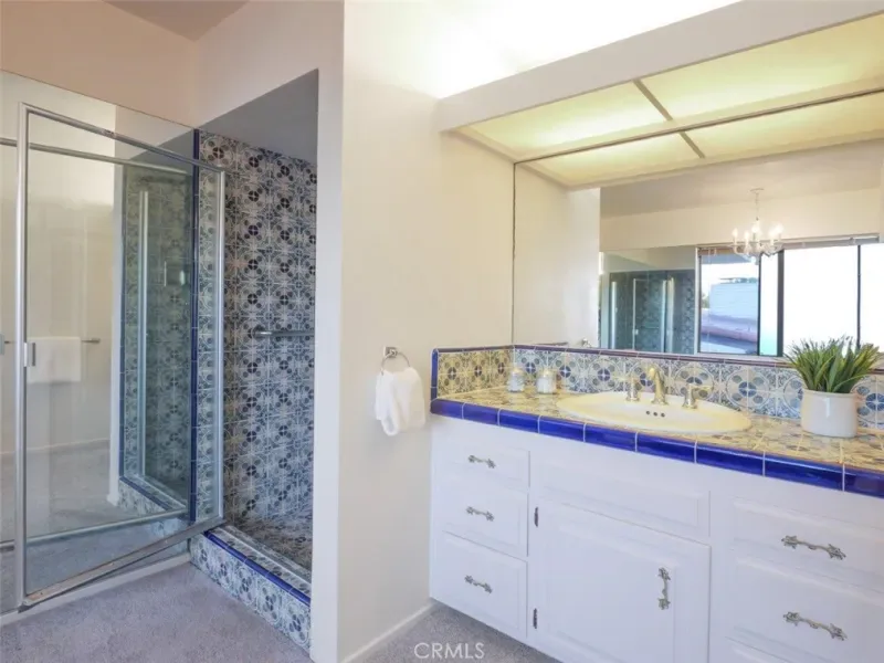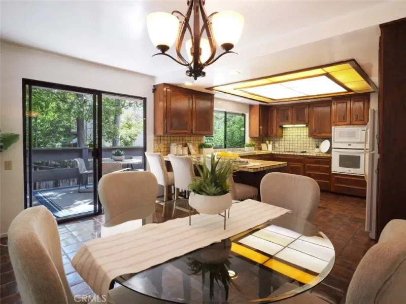 The Main Level features the Primary Suite, overlooking the backyard and offering multiple closets with mirrored doors. The en-suite bathroom includes dual sinks, a separate shower, and a soaking tub, accented by original cobalt blue tile from the home’s 1977 construction—full of vintage charm. This level also provides direct access to the oversized two-car Garage, a Powder Room, Formal Dining Room, and a Kitchen with Breakfast Bar, casual dining area, and sliding doors leading to a peaceful wood Deck nestled among the trees.