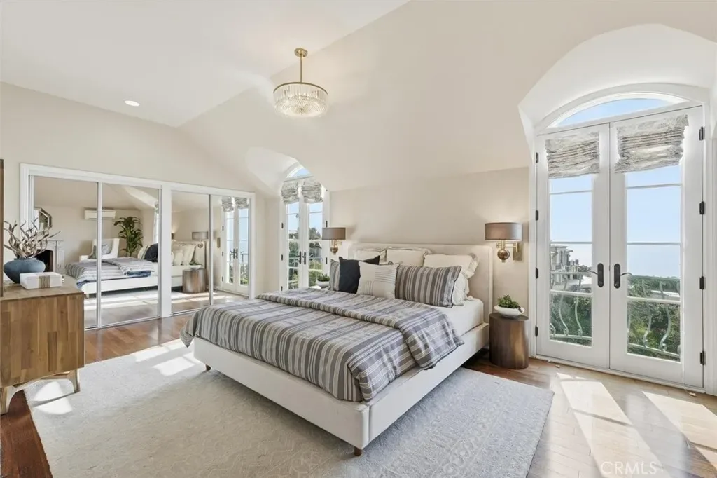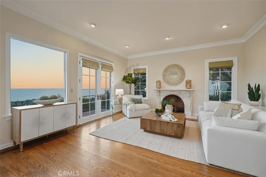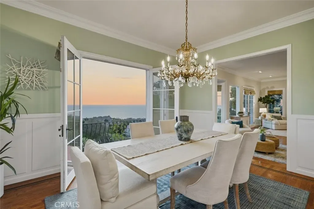 The main level also features a formal dining room, a chef’s kitchen with high-end appliances, walk-in pantry, and eat in kitchen, a spacious laundry room with extensive storage, direct access to the three-car garage, and a guest bedroom adjacent to a newly updated bathroom—all enhanced by elevated ceiling heights and sweeping coastal vistas.