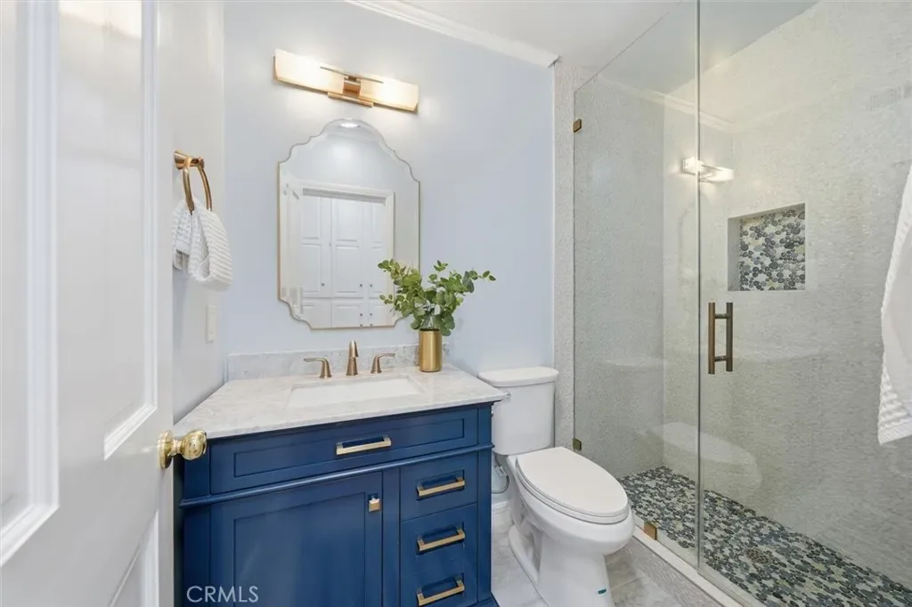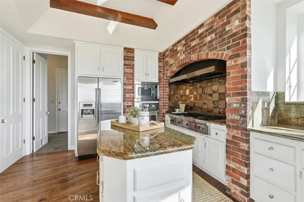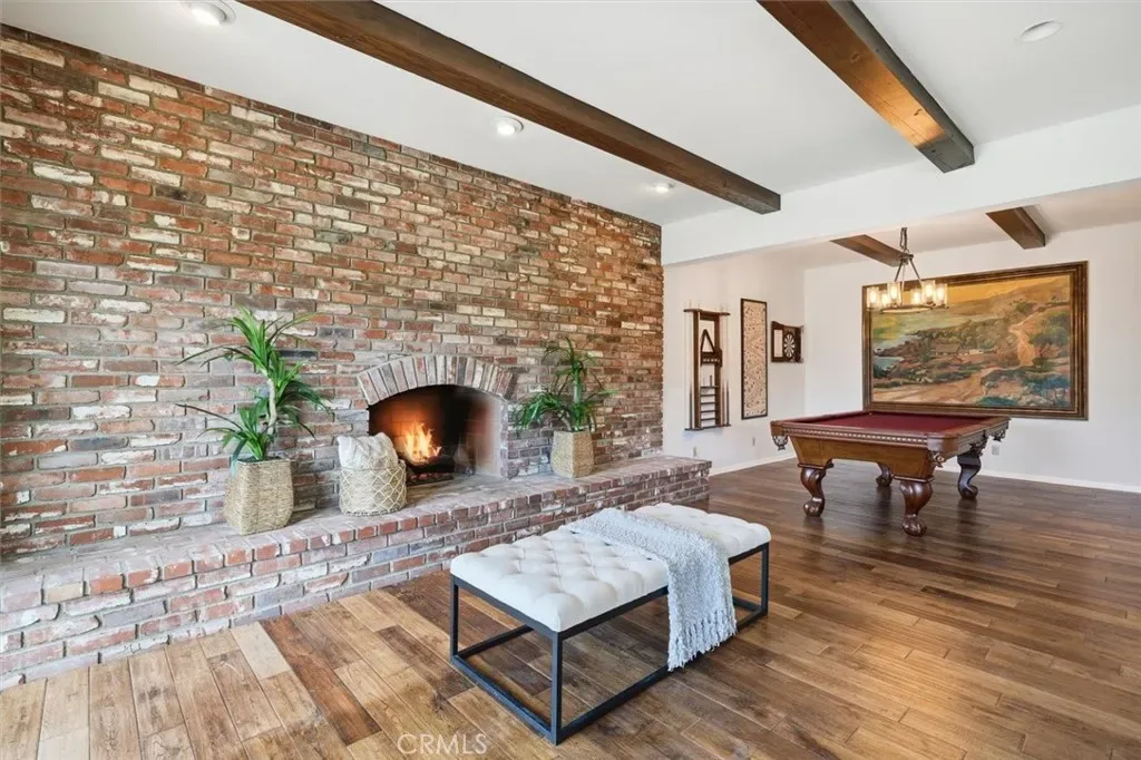Designed to comfortably accommodate multi-generational living, the lower level functions as a private living space of its own. This level includes a generous family room with 12′ beamed ceilings, wood-burning fireplace, wet bar, hobby or workout room, and French doors opening directly to the brick backyard. Outdoors, enjoy an above-ground spa and built-in BBQ—perfect for relaxed coastal entertaining. Two bedrooms and two bathrooms complete this level, offering flexibility for extended family, guests, or long-term living arrangements.