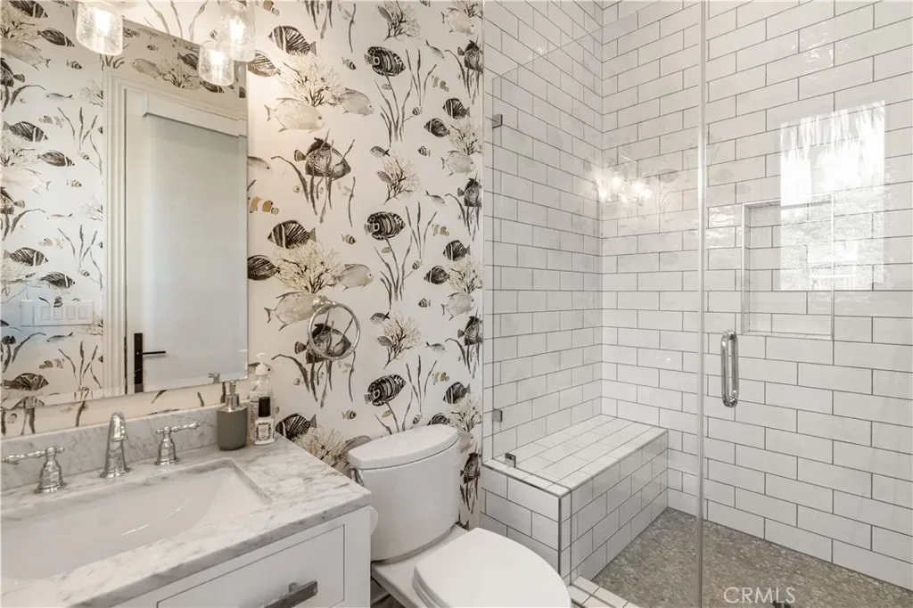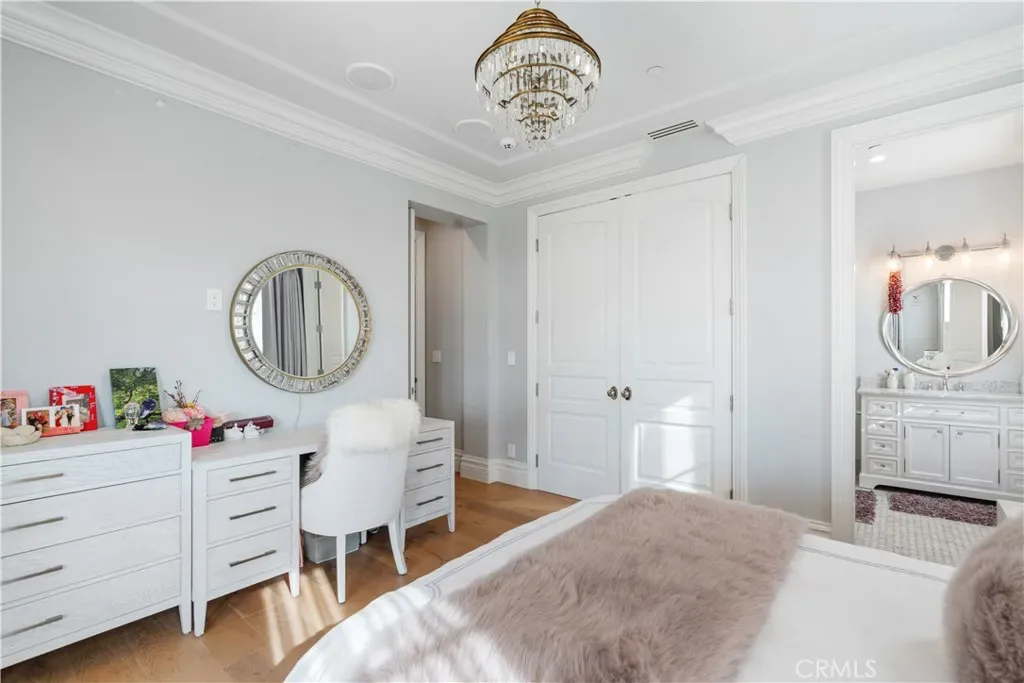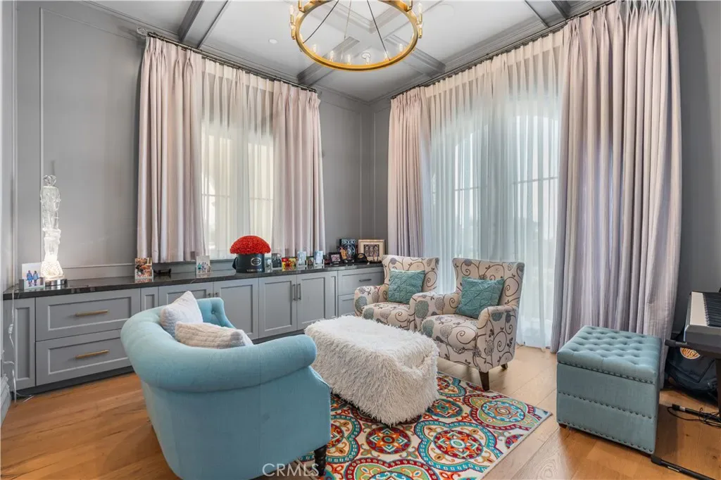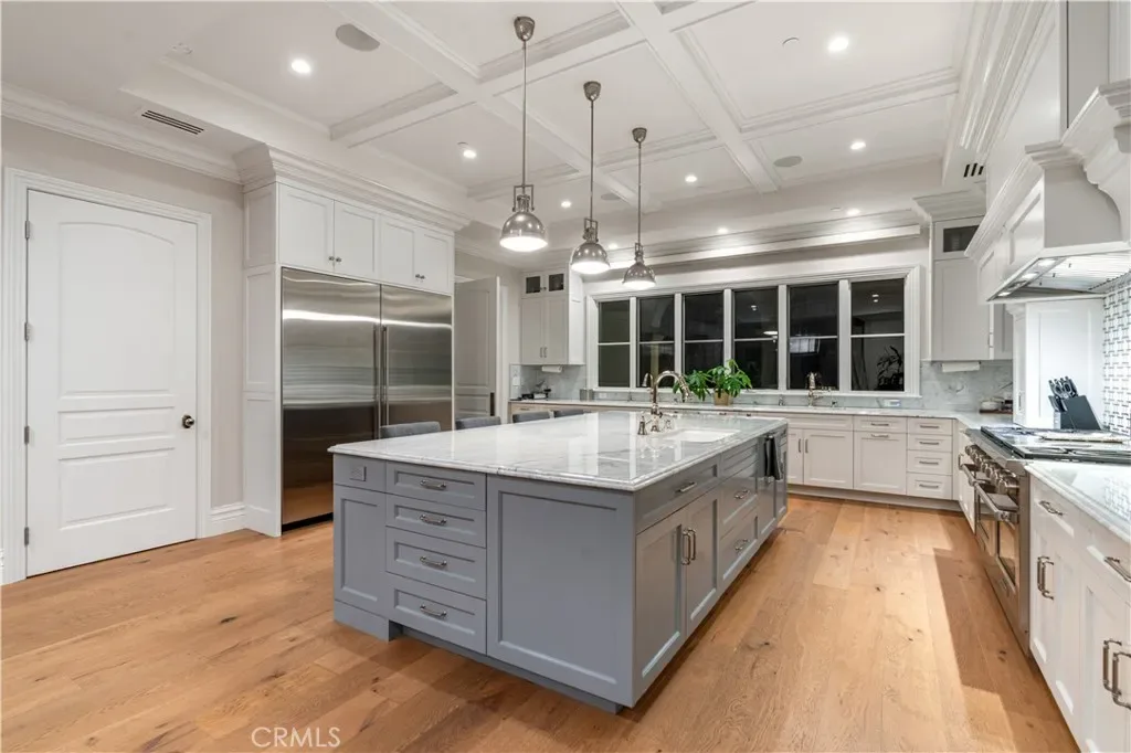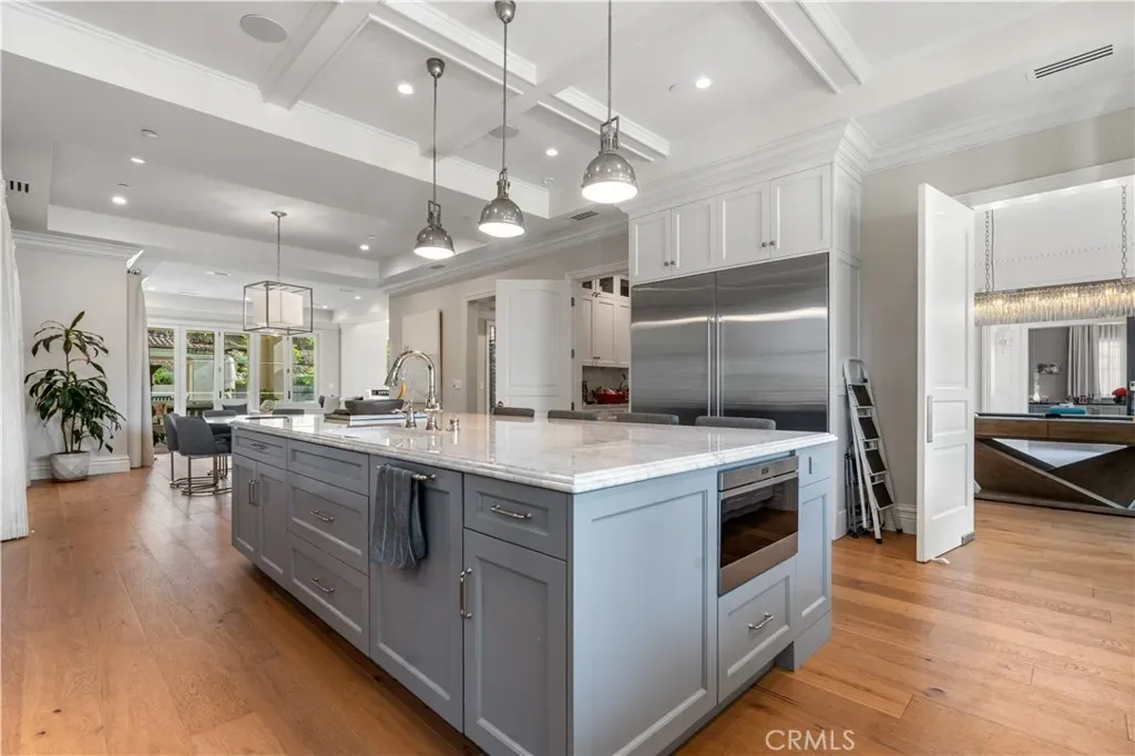 The gourmet chef’s kitchen is equipped with high-end Wolf and Sub-Zero appliances and a large island topped in imported Carrara marble. The main level includes a guest bedroom with en-suite bath, a private office with attached bath, a total of 4 bathrooms, and an exceptional home theater perfect for entertaining or family movie nights.