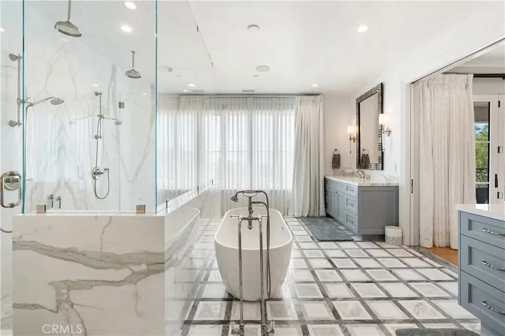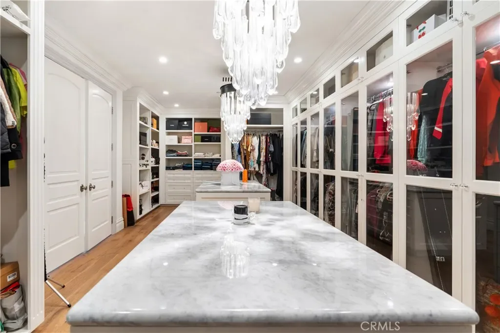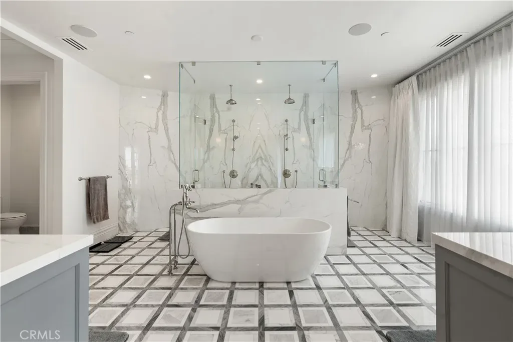 Upstairs, accessible by three staircases or an elevator, wide hallways overlook the grand living area below. The luxurious primary suite features a fireplace, automated window coverings for abundant natural light, a covered balcony ideal for sunset viewing, a spa-inspired bath with soaking tub, dual-head walk-in shower, custom cabinetry, Carrara marble inlaid floors, and his-and-hers vanities. The expansive walk-in closet includes custom built-ins and dual center islands.