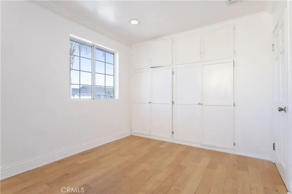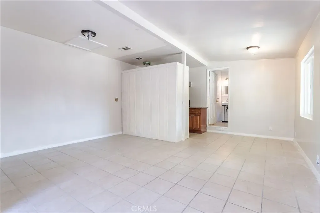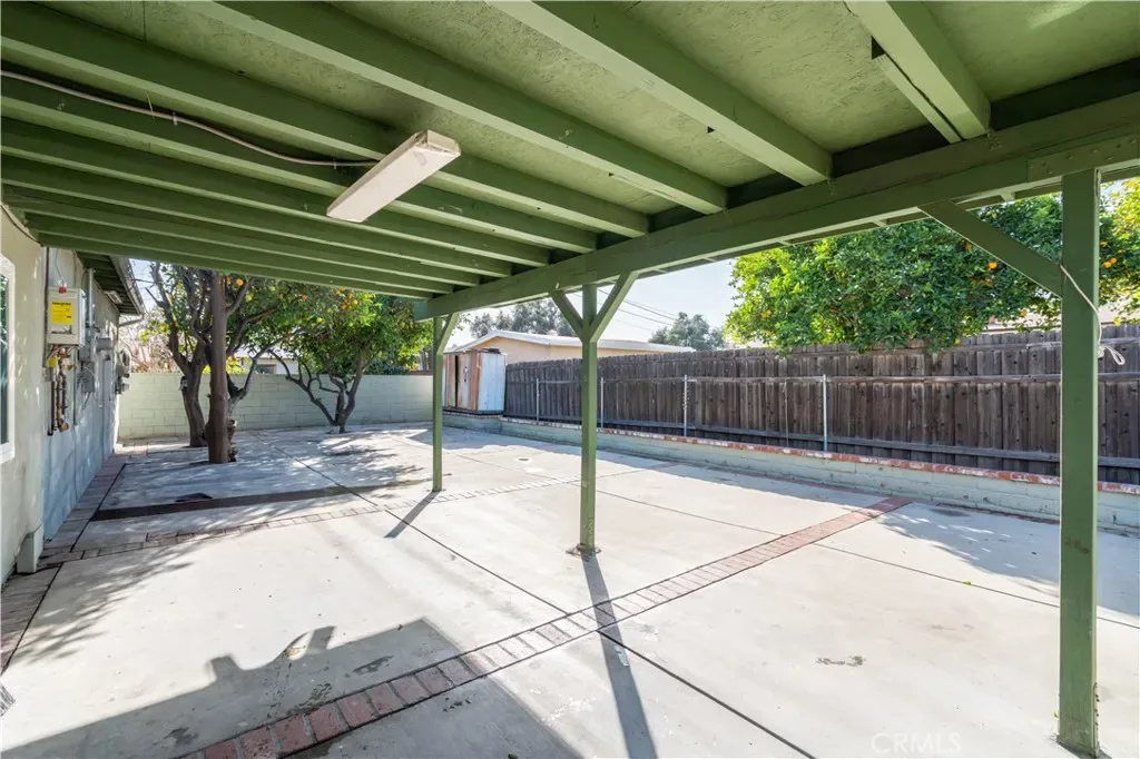 The home also includes an attached guest unit with its own private entrance. The front yard provides ample secured parking for multiple vehicles behind a block wall and wrought-iron gate, along with a covered carport and mature palm trees. The private, low-maintenance backyard features mature orange trees, a covered patio, and a convenient storage room.