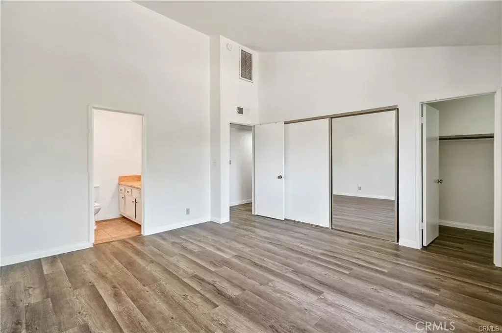 Upstairs, the primary suite serves as a true retreat with soaring vaulted cathedral ceilings, dual closets including a spacious walk-in, and a private ensuite bath. The primary bedroom overlooks the beautiful park, providing serene views. The generous second bedroom features its own sliding glass door leading to a private open-air balcony.