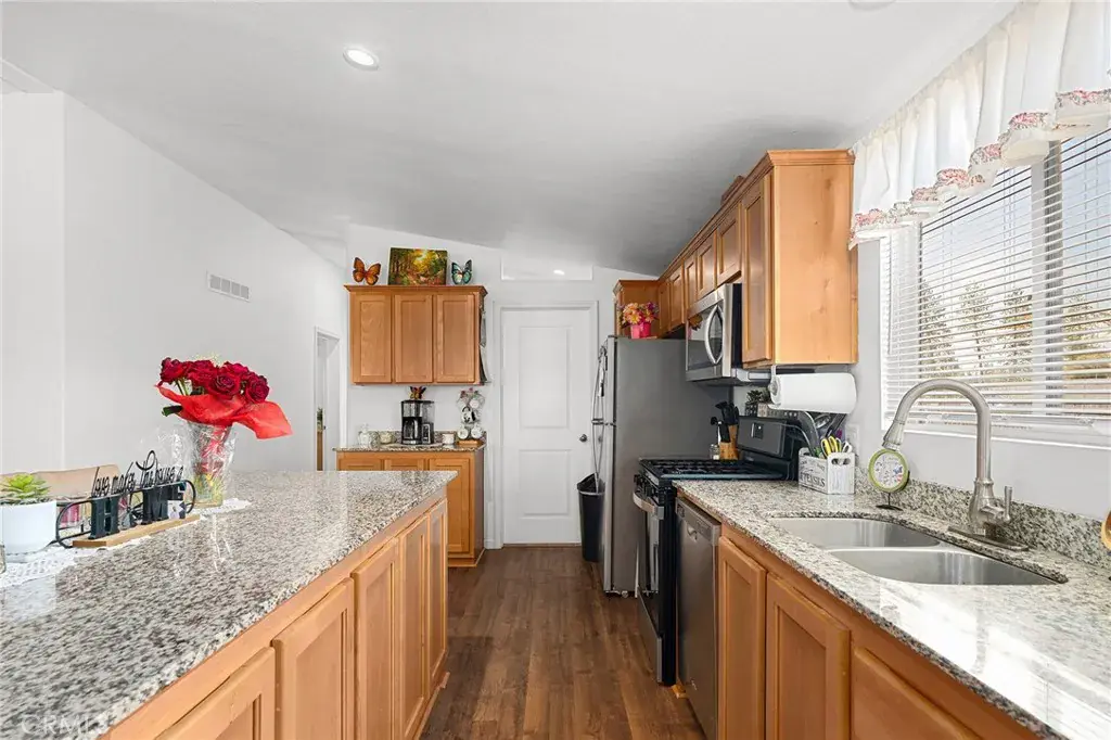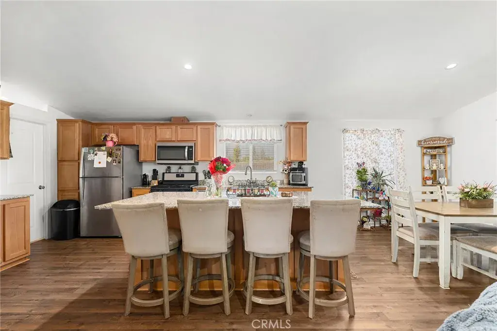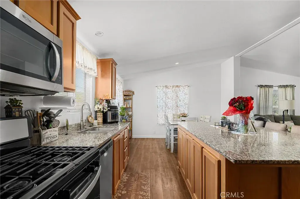 The spacious living area is perfect for relaxed evenings or casual get-togethers. The kitchen is a true highlight, featuring warm wood cabinetry, granite countertops, stainless steel appliances, a gas range, and a large center island with a breakfast bar—ideal for morning coffee, quick meals, or entertaining guests while you cook.