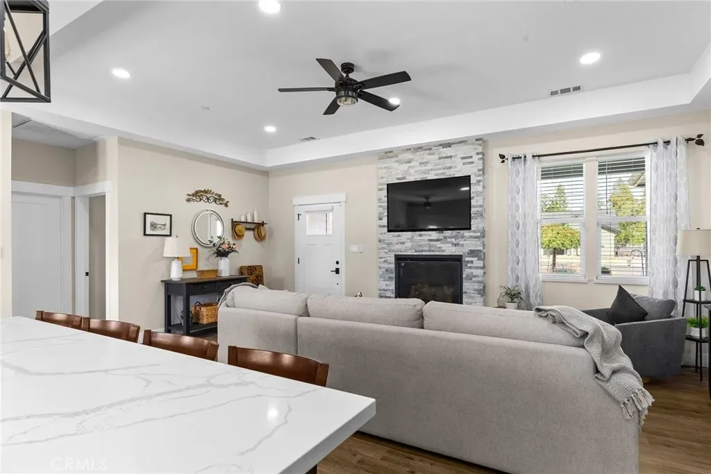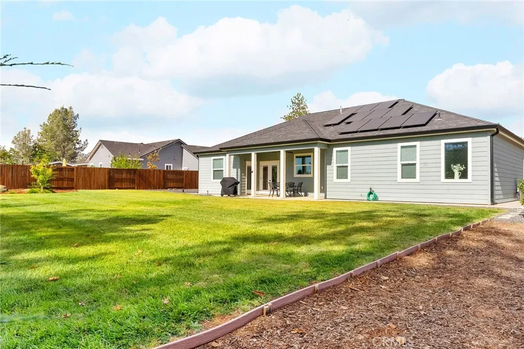 MOVE-IN READY never looked so good! Owned solar, fully landscaped front/back yard and RV parking are just a few of the thoughtful upgrades that make this home as efficient as it is comfortable—perfect as you head into the beautiful summer months. Built in 2021 and truly better than new, this property offers completed front and backyard landscaping, including mature citrus trees with Meyer lemon and Mexican lime, full perimeter fencing, and generous gated RV parking. Step inside and immediately feel at home in the spacious open-concept layout. The inviting living area is anchored by a stunning floor-to-ceiling slate hearth fireplace, while the expansive kitchen island creates the perfect gathering space for entertaining and everyday living. The kitchen is beautifully finished with stainless steel appliances, quartz countertops, soft-close cabinetry, and a sink positioned to take in a picture-perfect view of the lush backyard. The dining area opens through French doors to a large, covered patio, creating a seamless indoor-outdoor flow that’s ideal for year-round BBQs and relaxing evenings. Designed with a popular split-bedroom floor plan, the home offers both comfort and privacy. The spacious primary suite features a large walk-in closet with built-in storage, a luxurious soaking tub, a step-in tile shower, dual vanities and private access to the expansive covered back patio. Two additional bedrooms and a full bath provide flexibility for guests or family, each with oversized closets and abundant natural light, while the rear bedroom offers its own patio access—perfect for a potential second suite. Additional features include a well-appointed indoor laundry room with counter space and overhead cabinetry and a large walk-in pantry. Since purchasing new, the seller has made extensive improvements, including the addition of owned solar, a Generac backup power system with battery, expanded fencing and gates, a security system, custom window coverings, additional concrete for mow strips and walkways, and fully landscaped front and backyards. Located on a quaint street in desirable south Paradise, known for its prime elevation for gardening and surrounded by newer custom homes, this property offers a peaceful setting with easy commutes to Chico and Oroville. With energy efficiency and potential insurance savings, this home not only provides comfort but helps reduce monthly costs. All the work has been done—now it’s your turn to move in and enjoy.