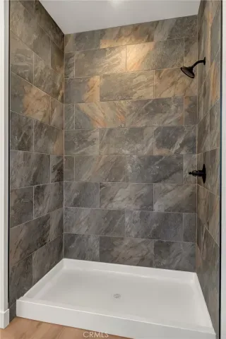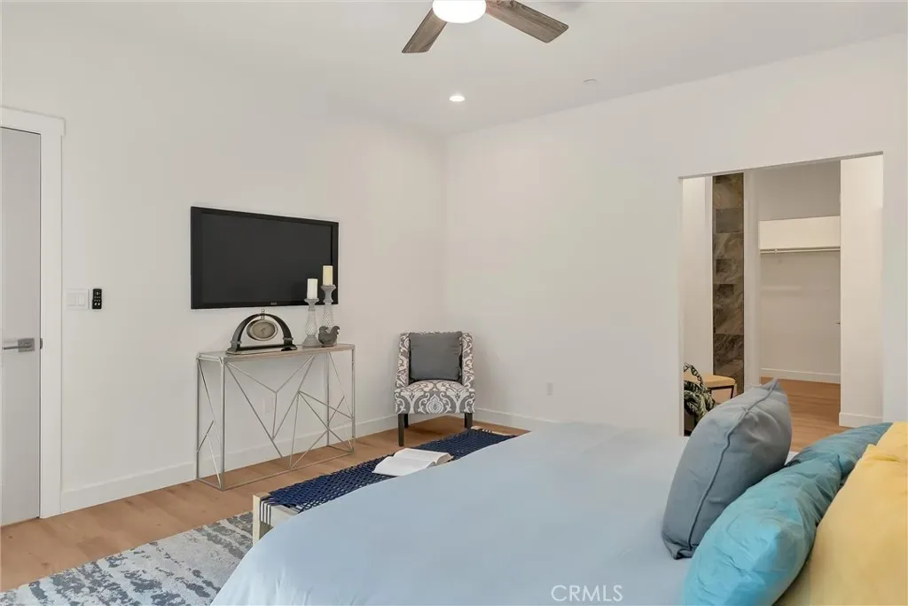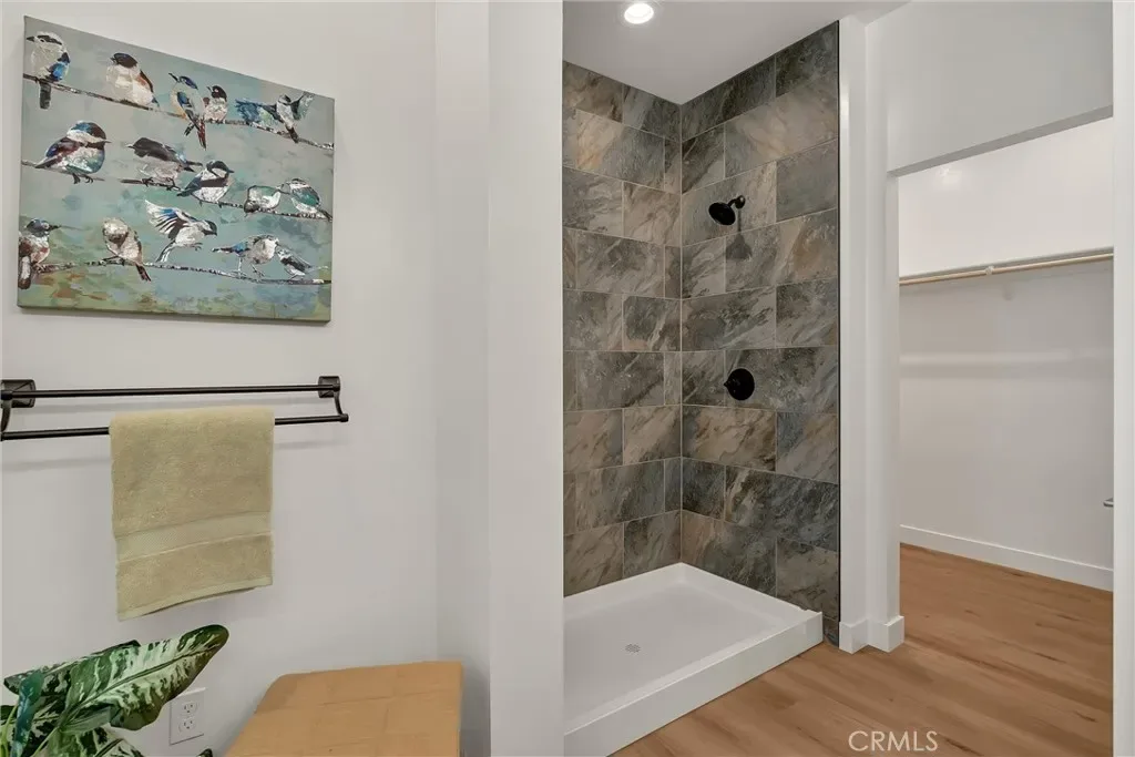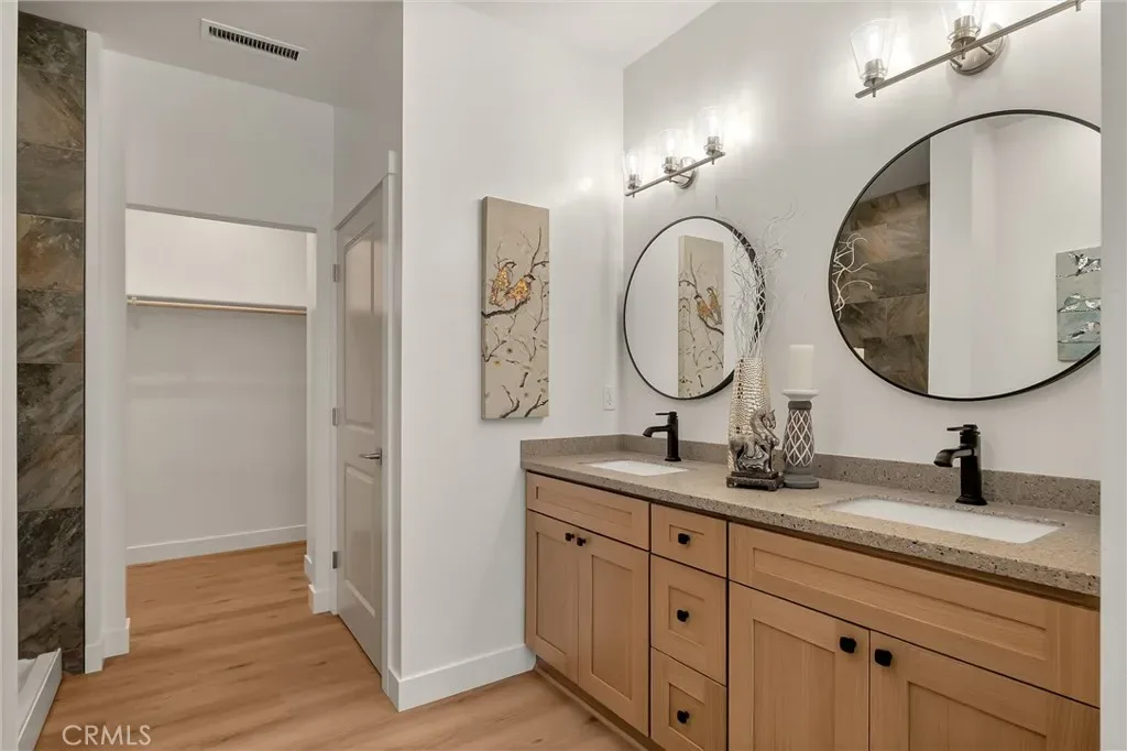 The primary suite is a private sanctuary, offering a spa-inspired en-suite bath with an oversized tiled walk-in shower, dual-sink vanity, and a generous walk-in closet.