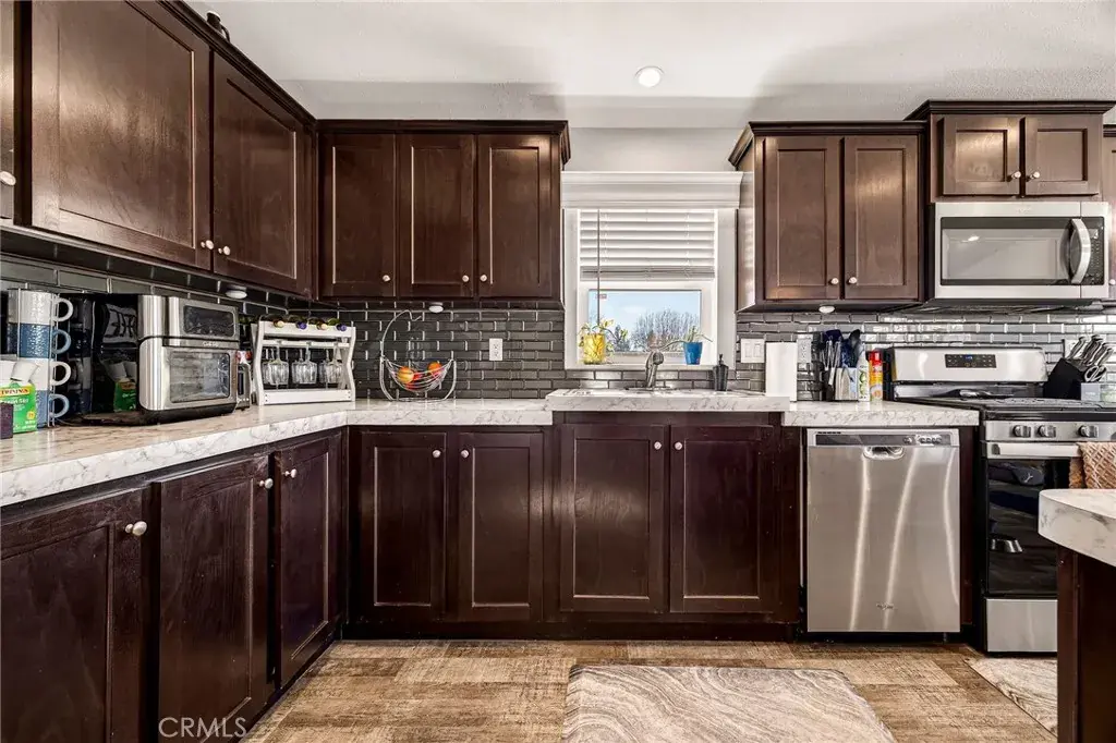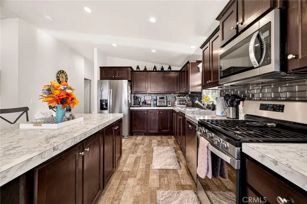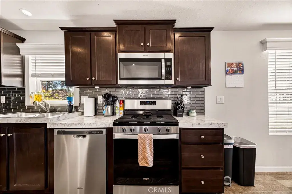 Tucked away at the end of a cul-de-sac, this beautiful 3-bedroom, 2-bath home is full of upgrades and room to let your creativity soar. Step inside to a spacious living area with recessed lighting and a ceiling fan, seamlessly flowing into an open-concept kitchen. Admire the authentic tile backsplash, large island, generous storage, and gas stove—plus, the refrigerator stays! Down the hall are two guest bedrooms with ample closet space, and a large laundry room with extra storage or space for a deep freezer. Additional hallway cabinets provide even more storage. The guest bath offers a tub/shower combo for versatility. The primary suite boasts a walk-in closet, ceiling fan, and bathroom with a walk-in shower, dual sinks, lighted mirrors, and elegant tile work. Outside, a sliding glass door leads to a spacious composite deck with stunning sunset views. The fenced backyard includes a drive-through gate, and the property is enhanced with orange, peach, maple, redwood, and oak trees. With newer gutters, underground utilities, extra parking, and RV hookups, this home truly has it all.