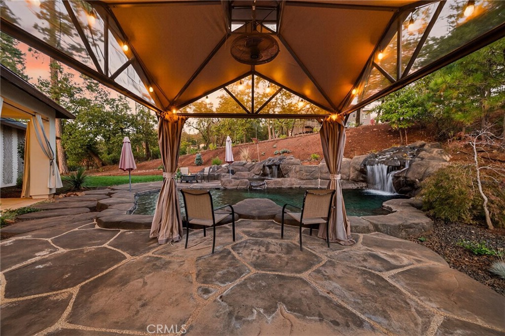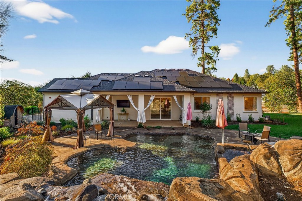 Your own private retreat awaits! Complete with a pool, spa, sauna, and stunning canyon views. Located on the desirable west side of Paradise, this beautifully upgraded home pairs elevated design with modern efficiency, all set against stunning canyon views. The backyard is designed for both relaxation and entertaining, featuring a heated, natural-style saltwater pool with a built-in spa and cascading waterfalls, all controlled right from your phone through the Pentair app. The outdoor space has been thoughtfully refreshed with newly leveled grounds, irrigation, lush sod, drip systems, fruit trees, and a striking gazebo with flowing drapes. A wood-fired barrel sauna adds the perfect finishing touch to this private outdoor retreat. Energy efficiency takes center stage with a Tesla solar system and dual Powerwall backup batteries, offering true energy independence. Easily monitor and manage your usage through the Tesla app while enjoying long-term savings and reliability. Inside, the home showcases quality craftsmanship with 12-foot ceilings, a grand entry, and custom lime-washed walls finished in Venetian plaster for a warm, elevated feel. The kitchen is built for both function and style, featuring premium ZLINE appliances, including a 36” range and wall oven, along with generous counter space. The primary suite offers a peaceful escape with dual walk-in closets, a soaking tub, walk-in shower, and views of the beautiful backyard. Just minutes from shopping, parks, and a convenient drive to Chico via Skyway, this location offers both accessibility and scenic surroundings. With its extensive upgrades, resort-style amenities, and thoughtful design throughout, this home delivers a truly standout living experience in Paradise.