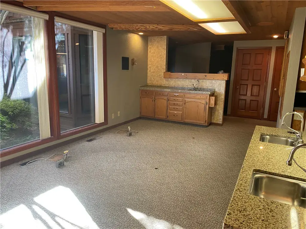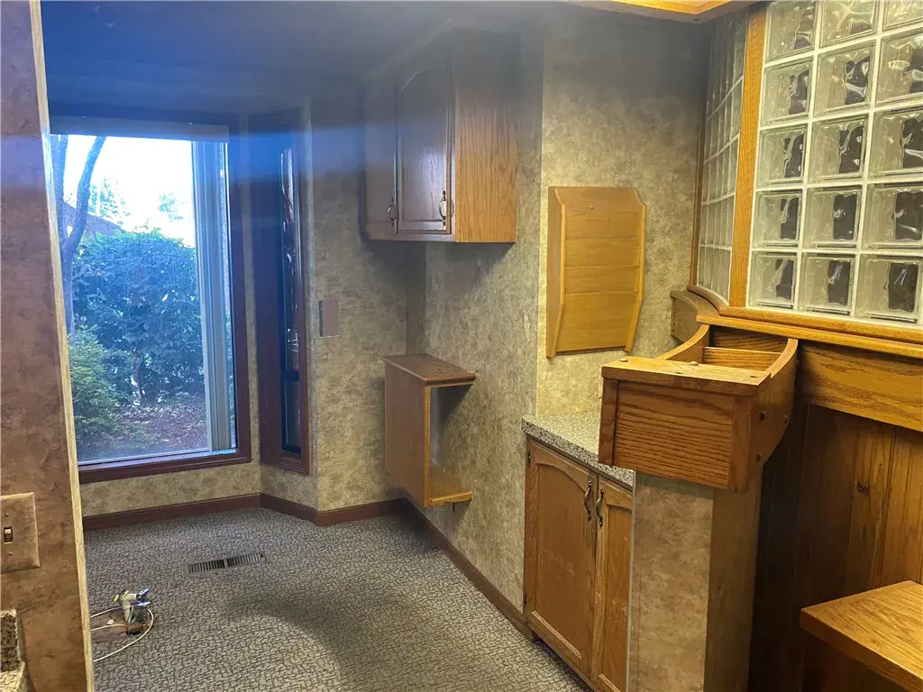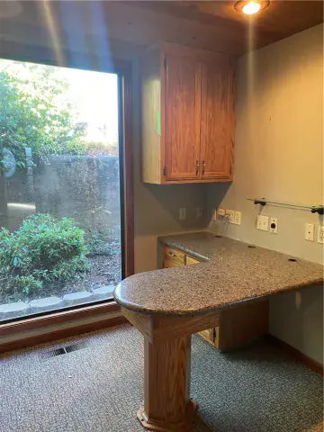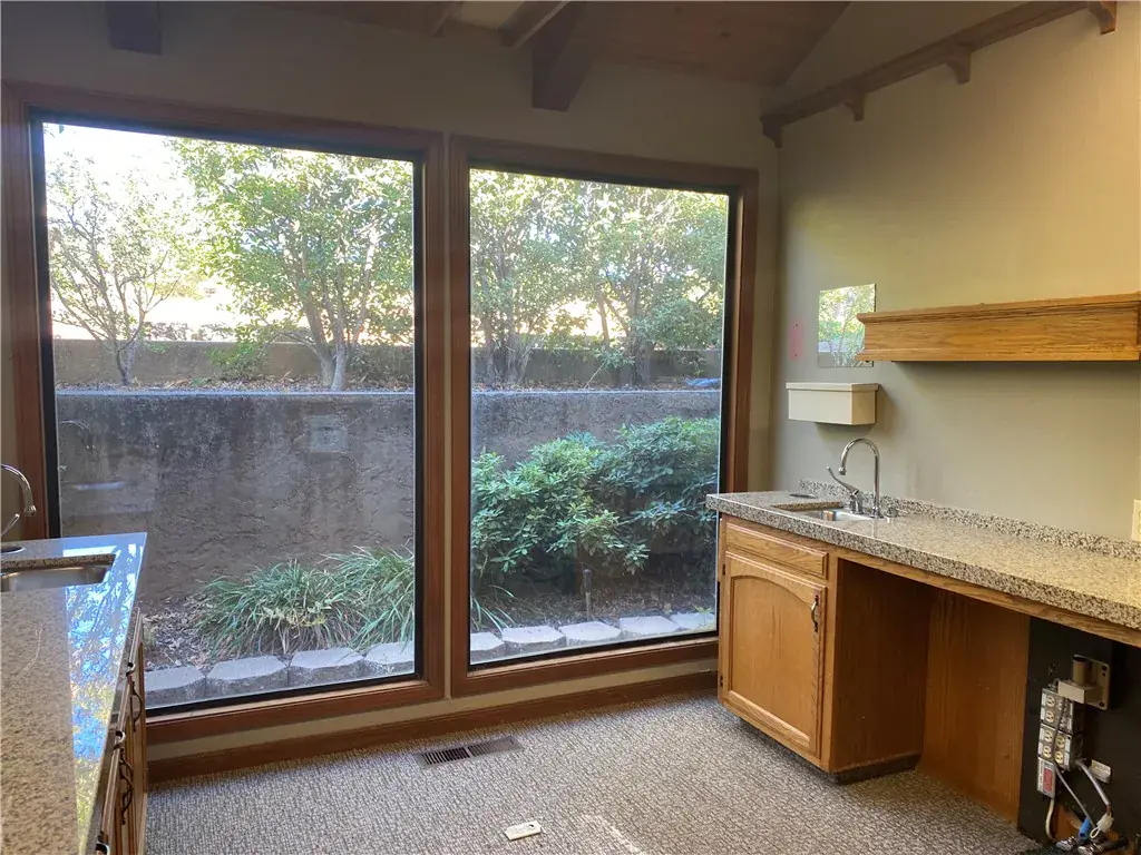 High-end finishes, including rich wood cabinetry and stone solid-surface counters, add warmth and professionalism throughout the suite.