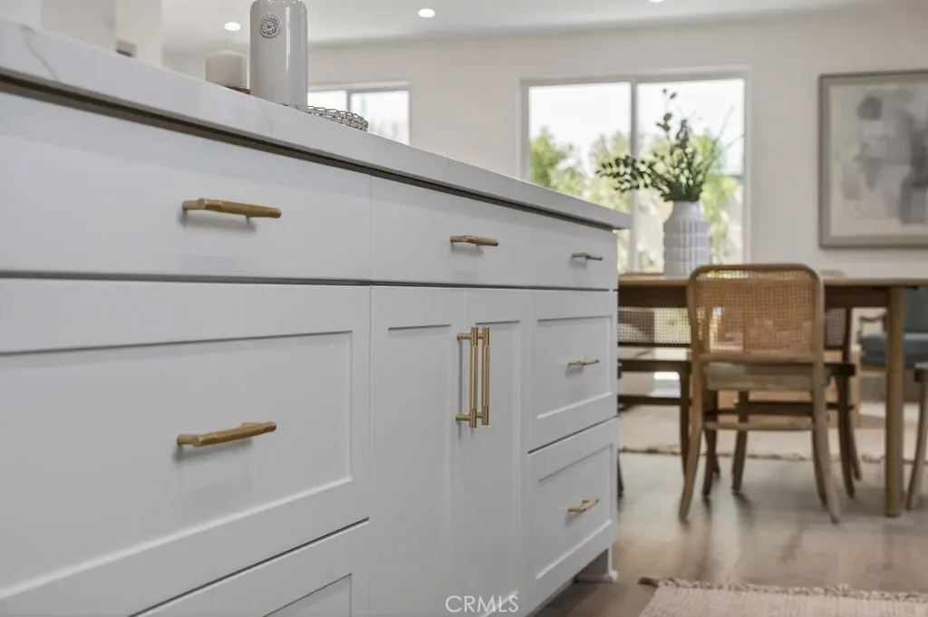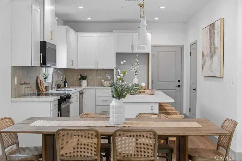 The first floor features living and dining areas that connect to a kitchen, creating an open space for daily living and entertaining. The kitchen includes quartz countertops, custom cabinetry with integrated storage, energy-efficient appliances, and modern finishes. Luxury vinyl plank flooring runs throughout.