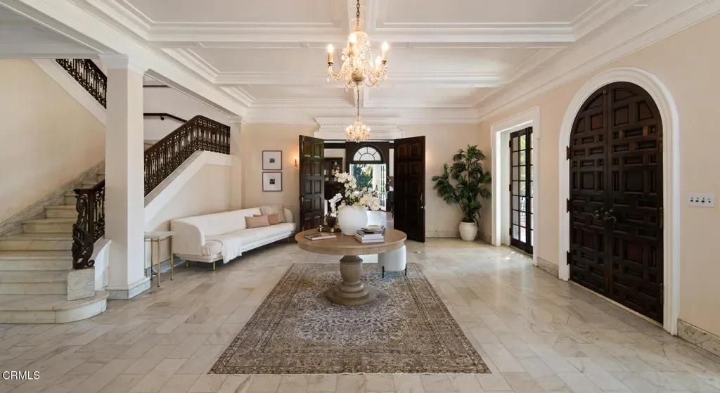 //Charles A Goodyear House, ‘Knollcrest’ by G. Lawrence Stimson, 1913// Built in 1913 for lumber baron Charles Goodyear and his wife, Henrietta, Knollcrest occupies 2.5 acres (Lots 18 and 19) within the original Oak Knoll subdivision. Widely regarded as one of the finest homesites in the development, its commanding position atop a gentle knoll–overlooking a sweeping front lawn–earned the estate its enduring name. //The residence was designed by prominent architect G. Lawrence Stimson, best known for the Wrigley Mansion. It is said that Goodyear commissioned the home, in part, to incorporate his extensive collection of custom-made furnishings and artifacts, resulting in a structure conceived to be entirely fireproof. Original wrought-iron gates frame the estate’s 330′ frontage along Oakland Ave, connected by a circular drive culminating in a porte-cochere. A rare secondary driveway, running N/S with automatic gate, is accessed via Allendale Rd. //True to Stimson’s architectural language, the main residence features stately mahogany-paneled public rooms w/10′ ceilings, upper-level bedrooms w/9′ ceilings, hand-carved moldings, marble flooring and staircase, and living room w/restored Caucasian walnut floors accented by ebony inlay. Remarkably, much of the original woodwork and artisan-crafted built-ins remain intact and in exceptional condition. Living space spans three levels, with additional attic area above. //A secondary structure–recently updated w/full kitchen and BA–serves as a guest house, adjacent to garage w/BA, and pool. In total, Knollcrest comprises 8,713 sf of living space across all structures, complemented by an additional 5,087 sf of garage/storage space. //Following the Goodyears, the estate was stewarded by a succession of prominent families, including U.S. Steel president Thomas Cole and department store scion and philanthropist Samuel Robinson, before being acquired by the current owner in 1966. In 1968, Knollcrest was selected as the 4th Pasadena Showcase House and has since served as the backdrop for numerous motion pictures. //Defined by its rich history, architectural pedigree, prominent setting, and intact original acreage, Knollcrest stands among Pasadena’s landmark estates. Offered for the first time in six decades, it represents a rare opportunity to steward a significant Los Angeles family estate for generations to come.