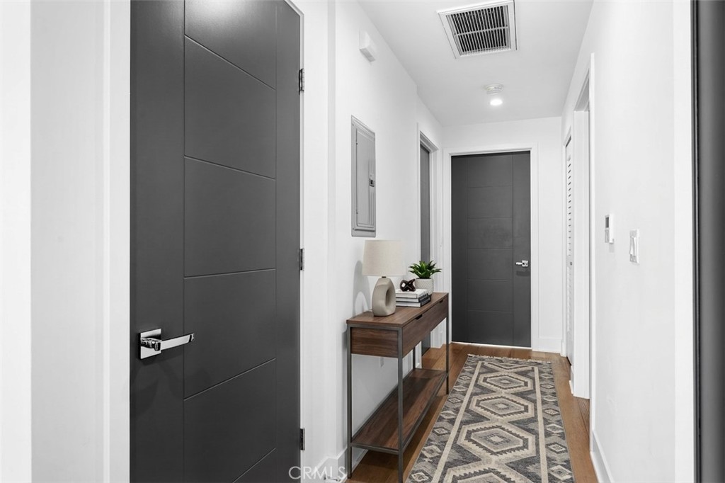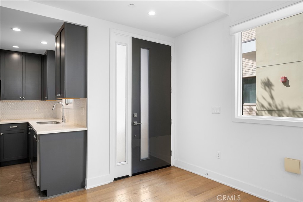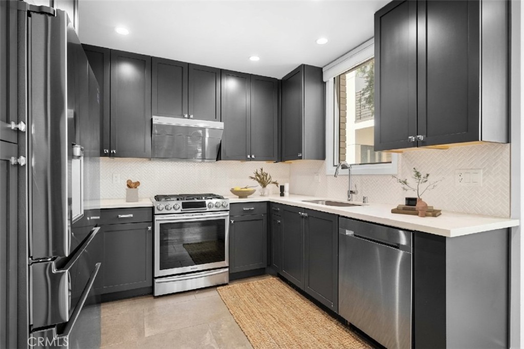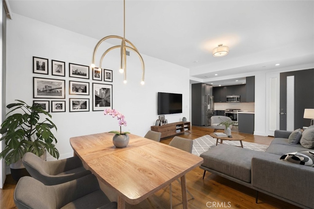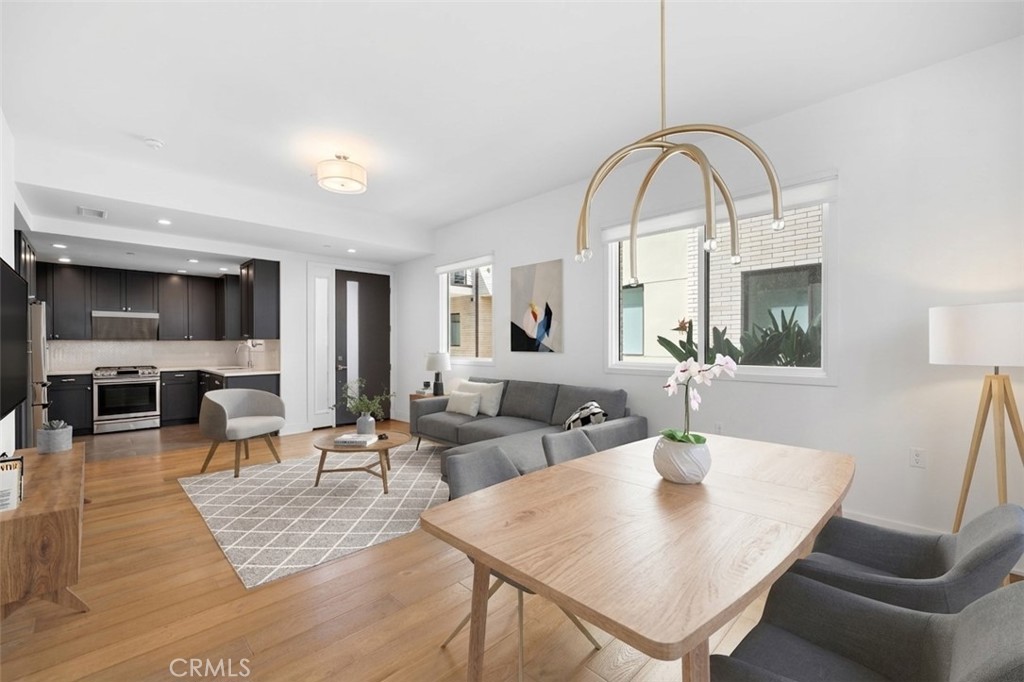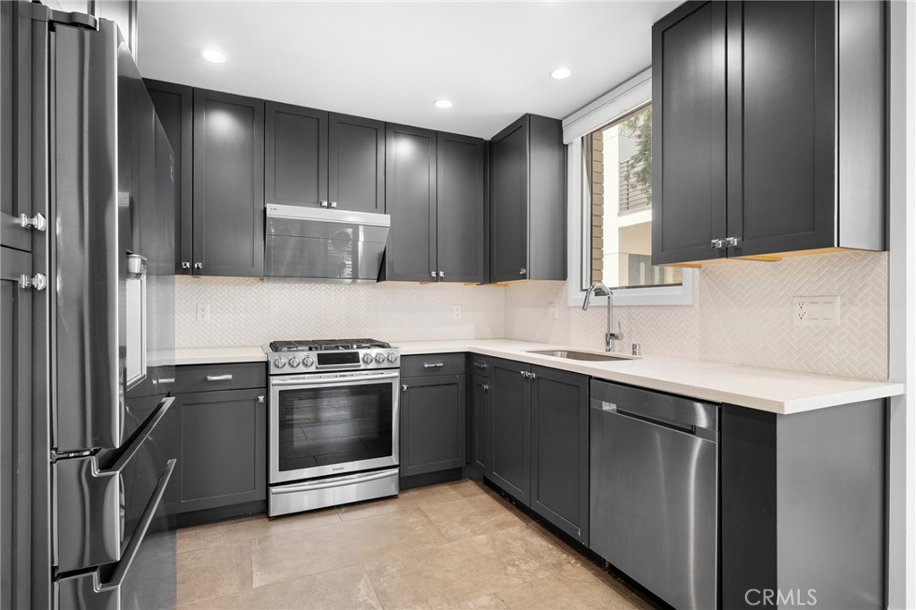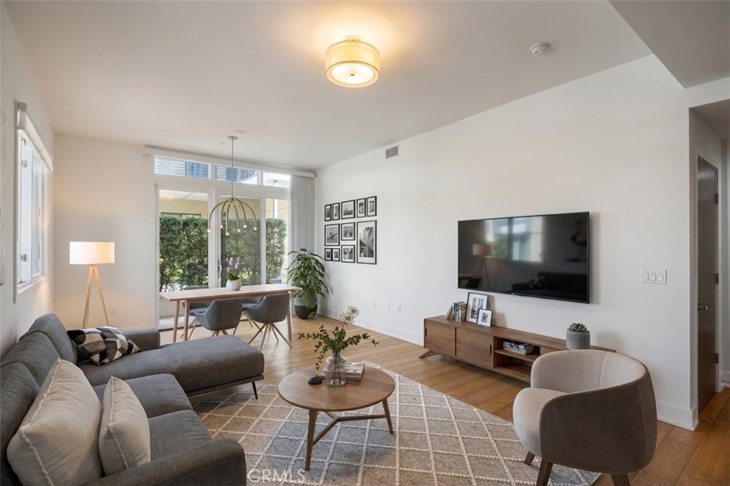 This serene courtyard-facing residence features a light-filled living and dining area that seamlessly opens to a private patio—perfect for indoor-outdoor living. The modern kitchen is beautifully appointed with quality cabinetry, quartz countertops, a stylish tiled backsplash, and upgraded stainless steel appliances.