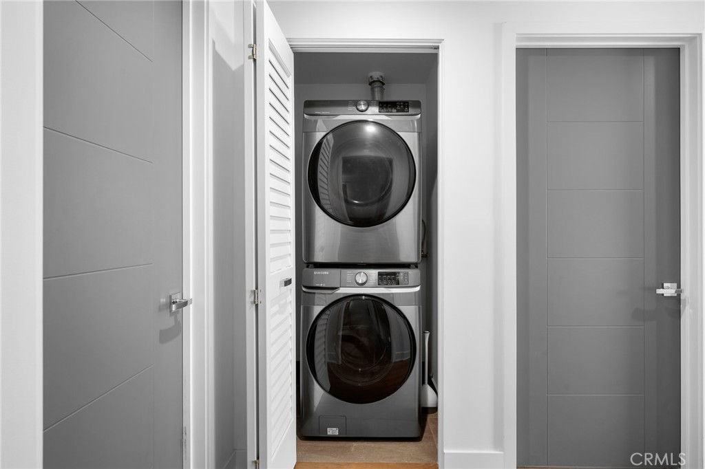 Additional highlights include an in-unit laundry closet with a newer stackable washer and dryer, elevator access, gated subterranean parking with two assigned spaces, a large private storage room, guest parking, and an EV charging station.