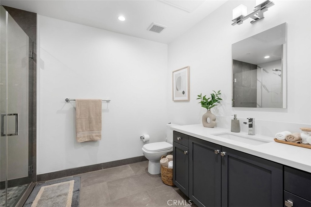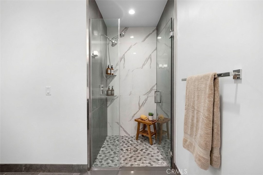 The home offers two generously sized bedrooms, including a spacious primary ensuite with ample closet space and direct access to its own private patio, along with a large full bath. The second bedroom is conveniently located near a well-appointed bathroom featuring a beautifully tiled step-in shower.
