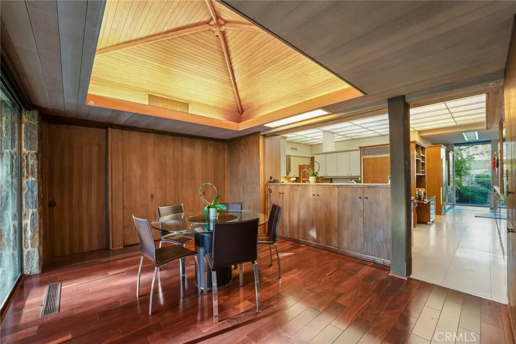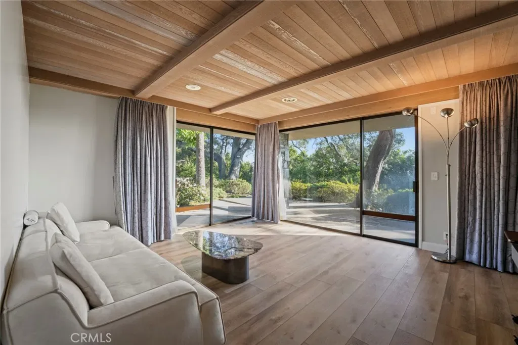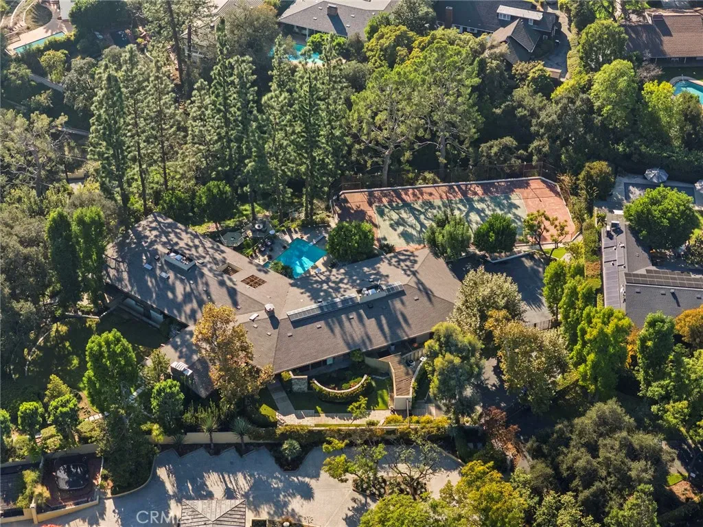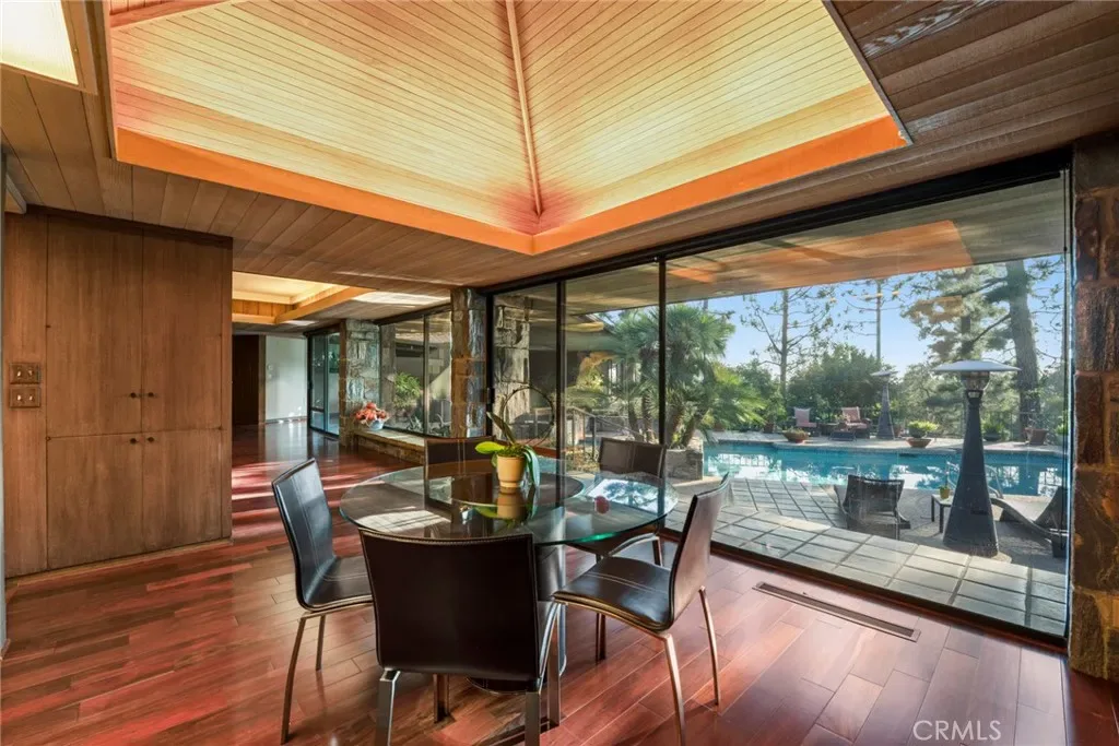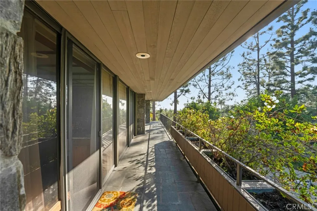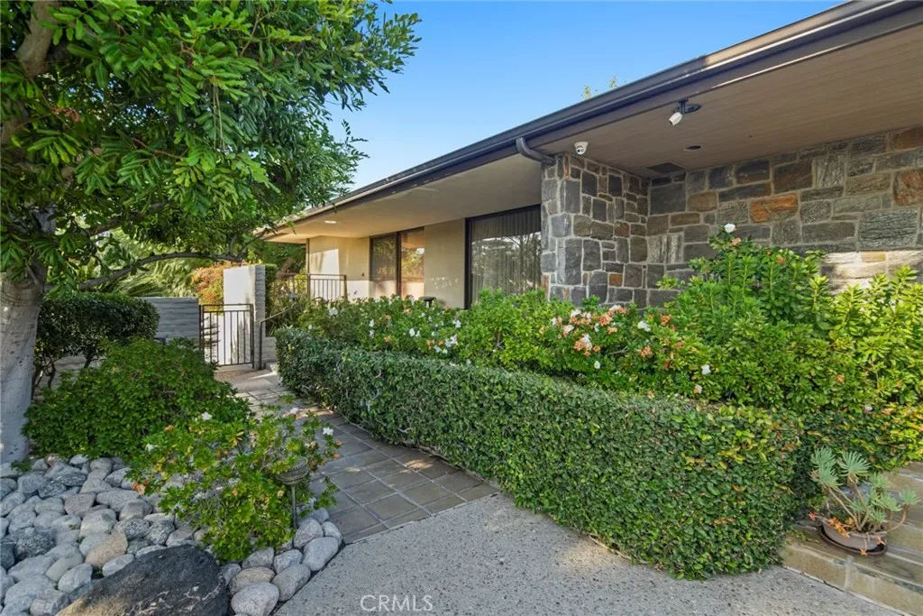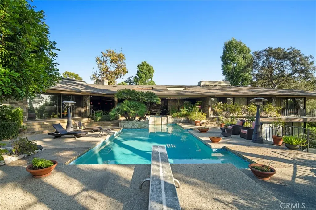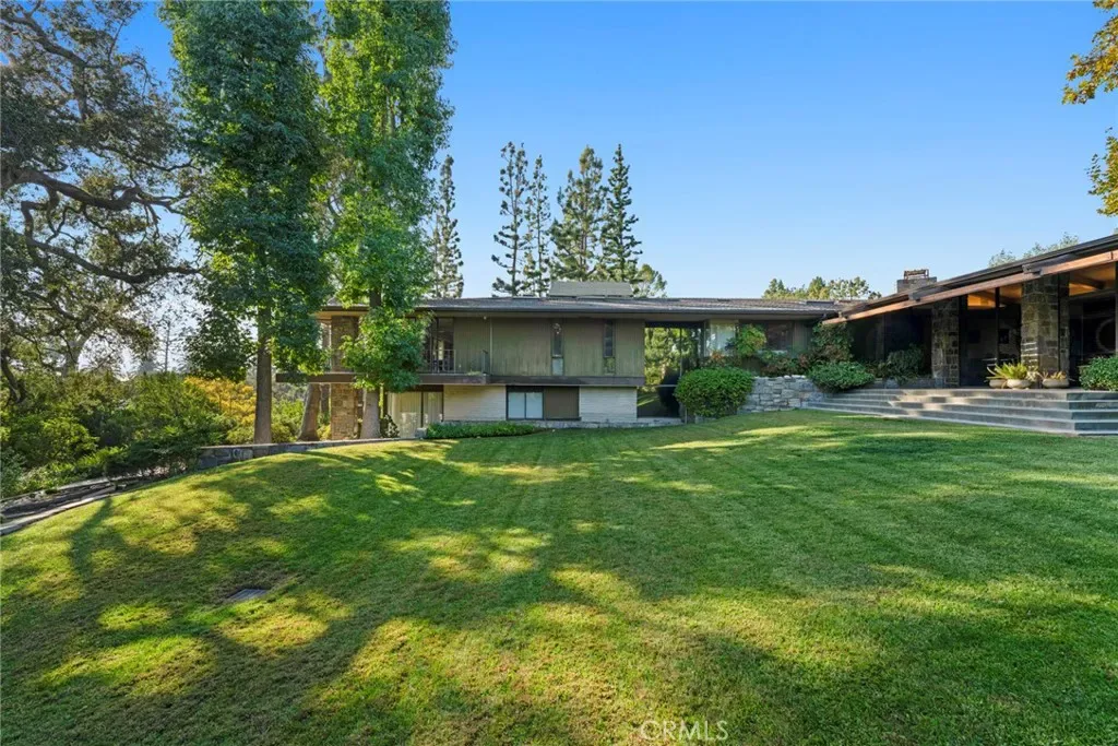 Perched on approximately 1.5 acres in the Langham Huntington enclave, this is a landmark Mid-Century Modern compound that celebrates glass, wood, and stone in harmony with sweeping garden and city-light vistas. Designed by noted architect Harold Zook, the residence showcases expansive window walls, crafted mahogany accents, and signature Bouquet Canyon stonework. An inviting foyer leads to voluminous living and dining spaces oriented to landscaped courtyards, while a catering-scale kitchen anchors a casual breakfast area and a generous family room with pool views. The private primary suite enjoys treetop panoramas, a sitting room, and dual dressing rooms/baths; four additional bedroom suites provide exceptional flexibility. Recent improvements by the current owner include a full remodel of the downstairs bedroom and new flooring throughout the home. Resort amenities span a sparkling pool, true north-south tennis court, and immersive gardens, complemented by skylights, dual-zone HVAC, security system, delivery reception area, potting shed, a four-car garage, and gated entry. A rare offering of scale, privacy, and pedigree in one of Pasadena’s most sought-after locations.