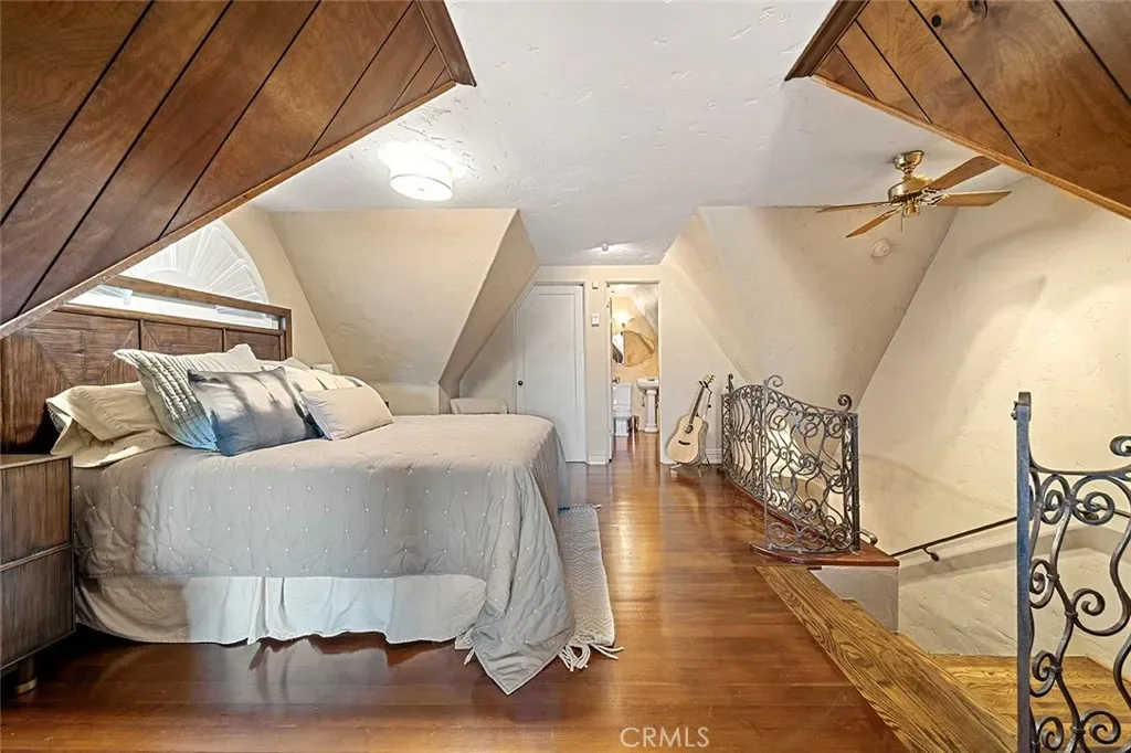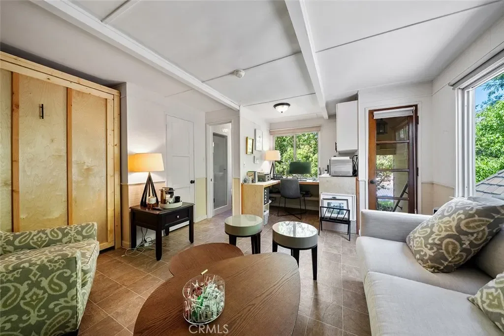 A charming attached apartment, accessed by a whimsical spiral staircase, includes a Murphy bed, built-in desk, couch, chair and refrigerator; ideal for guests, a home office, or rental potential.