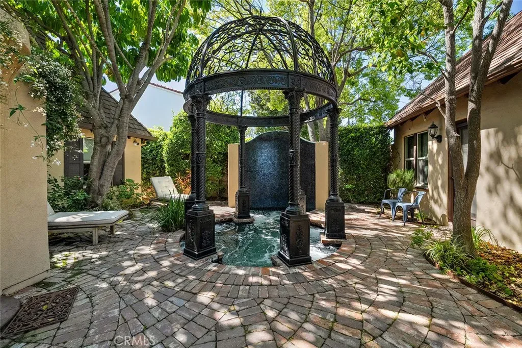 Modern upgrades include paid-off solar and a Tesla charging station. The expansive patio, iron gazebo, plunge pool, and waterfall create a private outdoor retreat. A gym/studio with steam room extends from the two-car garage.