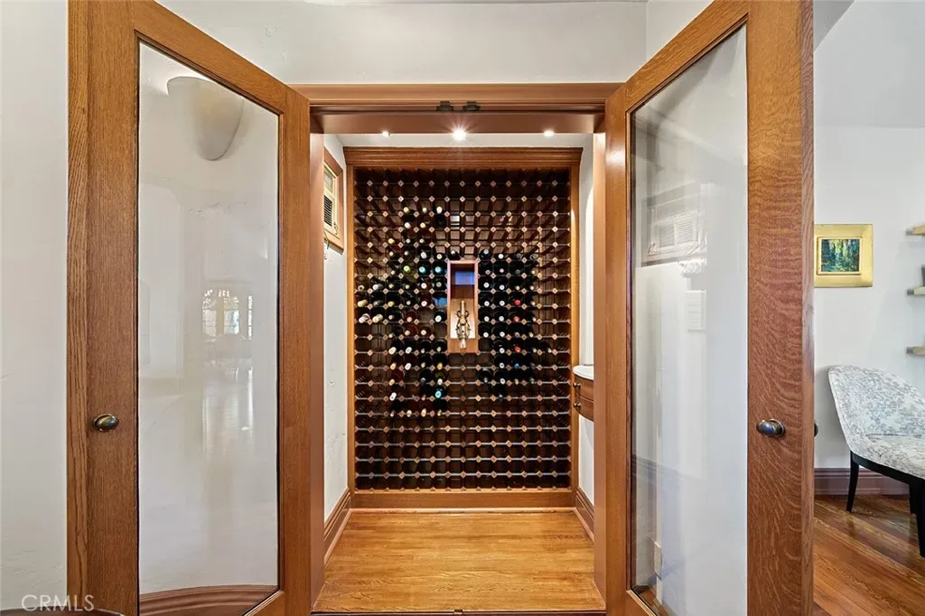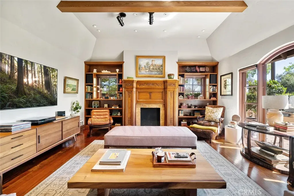 From the moment you arrive, illuminated by classic gas lamps, a sense of story and soul unfolds. Up the stairs leads to a formal entry w/ a reimagined entry closet that now serves as an inviting wine cellar; beckons to be enjoyed. The living room inspires with soaring beamed ceilings, abundant natural light from a large picture window, & a seamless connection to a front porch overlooking a lush, private yard framed by tall hedges. A grand Normandy fireplace mantel anchors the space w/ built in speakers.