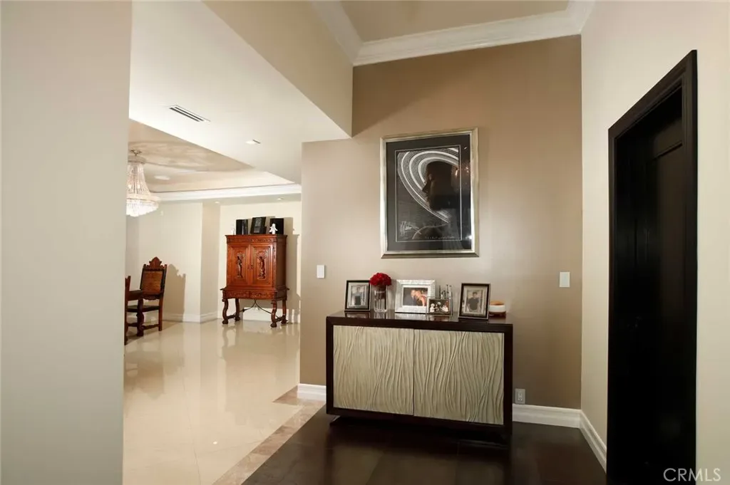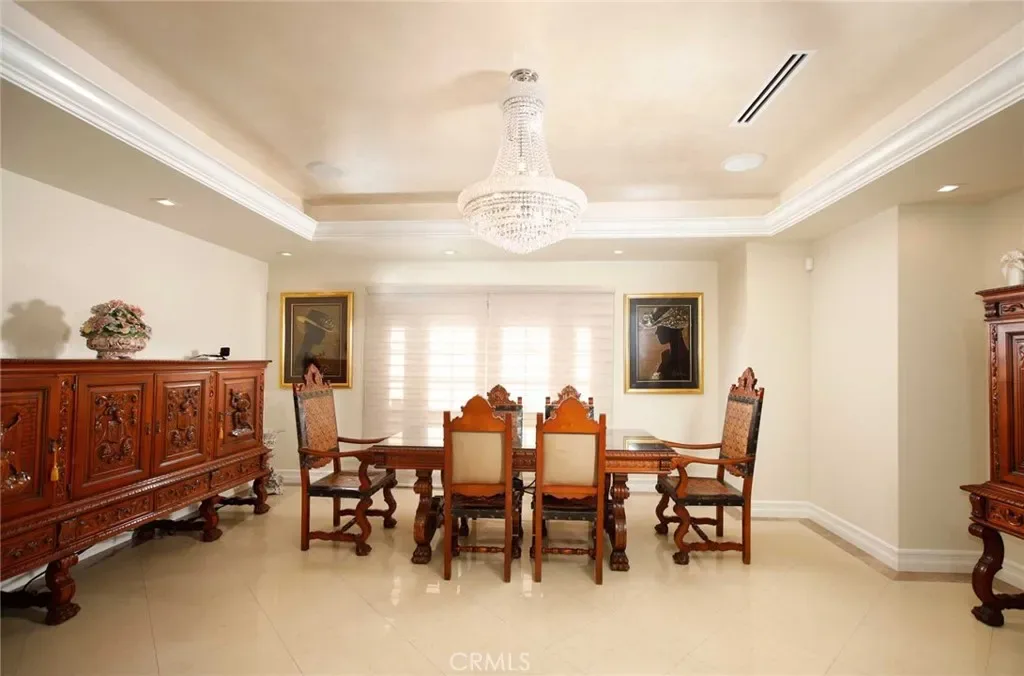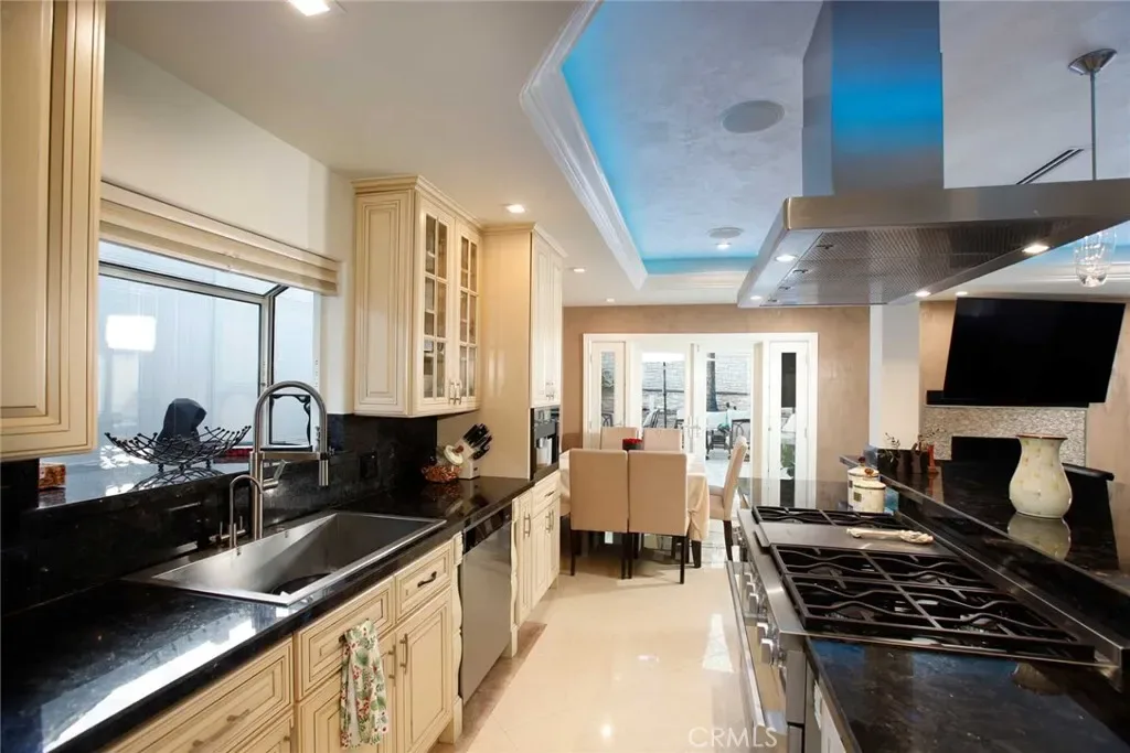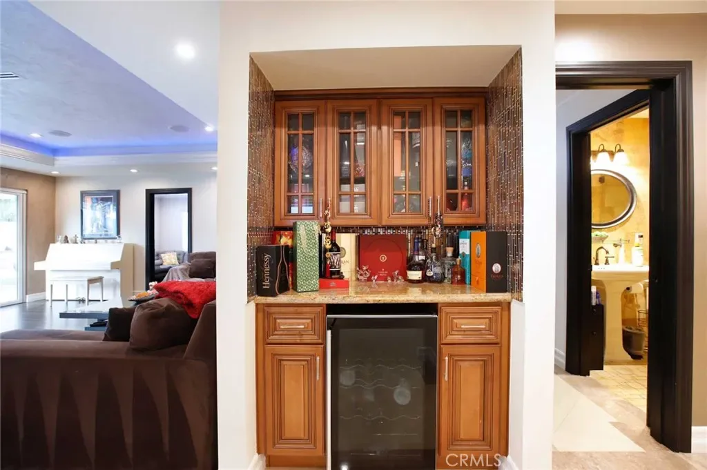 Step inside to find soaring soffited ceilings and elegant porcelain flooring throughout, creating a bright and sophisticated atmosphere. The thoughtfully designed open floor plan features a spacious living area, a large family kitchen with breakfast bar island, a separate formal dining room, and a stylish dry bar—perfect for both everyday living and entertaining. Custom built-ins are found throughout the home, adding both functionality and charm.