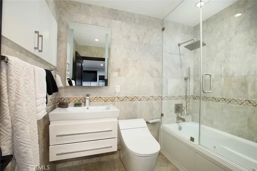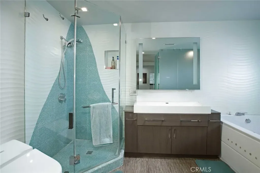 The primary suite serves as a private retreat, complete with a spa-inspired bathroom featuring a jetted soaking tub and refined finishes.