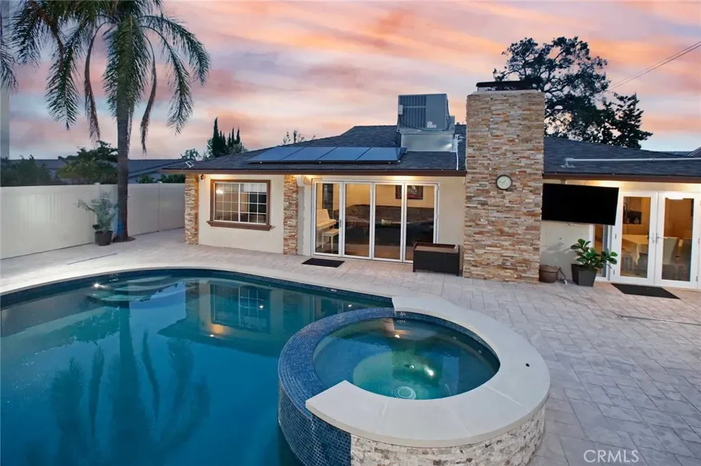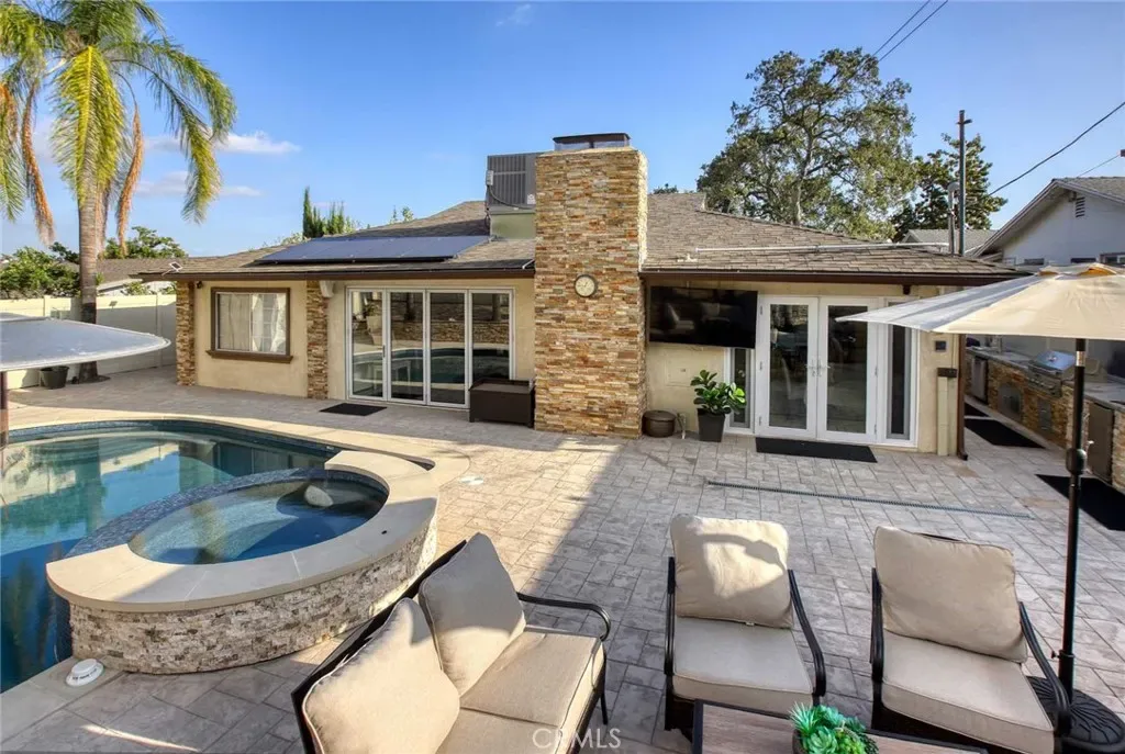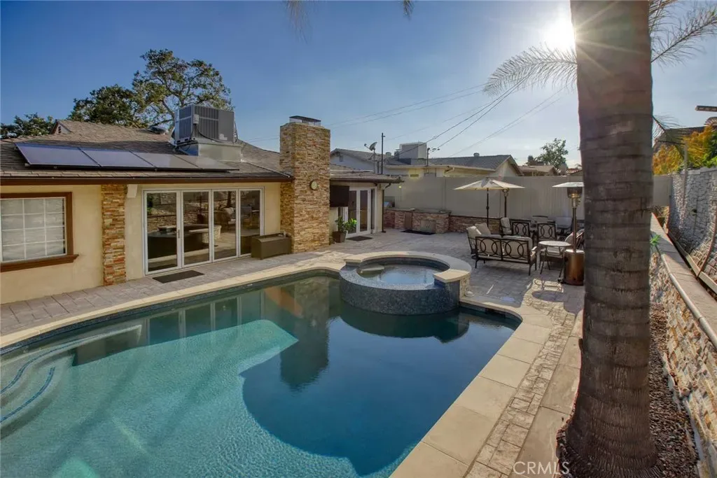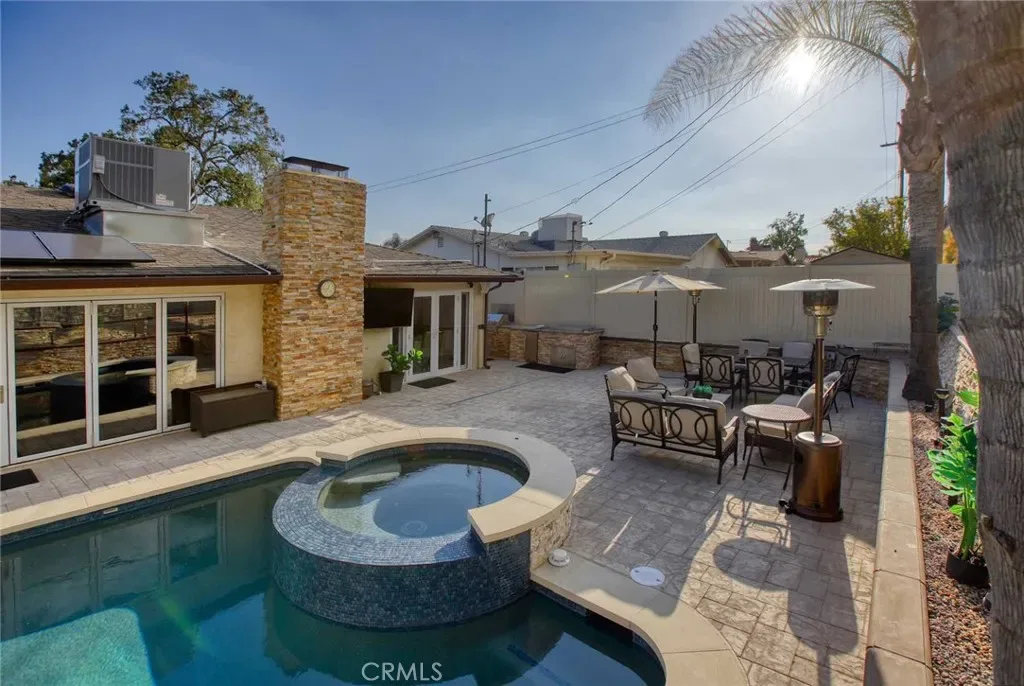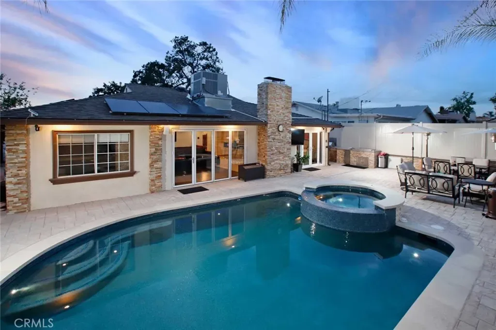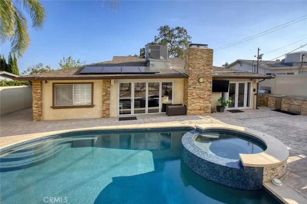 The backyard has been fully renovated into a true outdoor oasis, showcasing a brand-new pool and spa, BBQ area, updated hardscape, and lush landscaping—perfect for relaxing or hosting guests.
