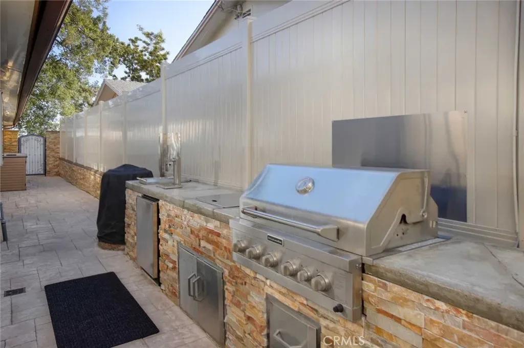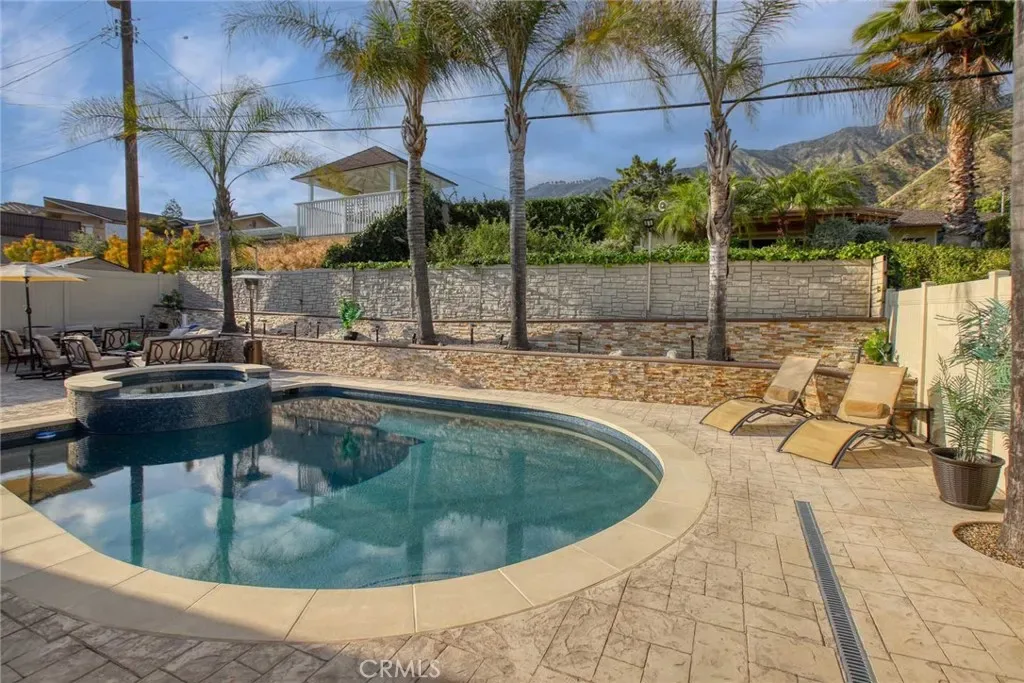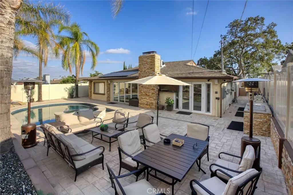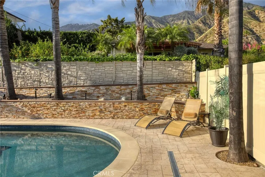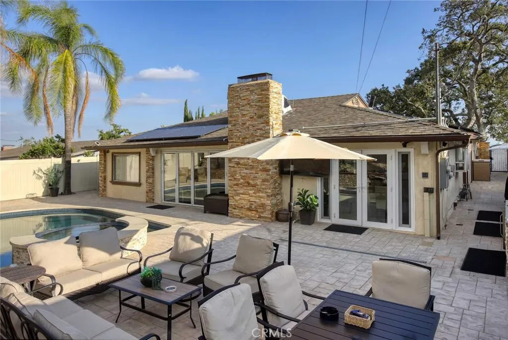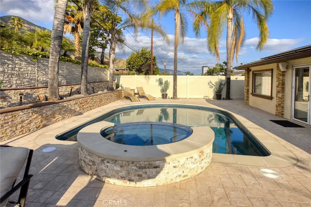 The backyard has been fully renovated into a true outdoor oasis, showcasing a brand-new pool and spa, BBQ area, updated hardscape, and lush landscaping—perfect for relaxing or hosting guests.