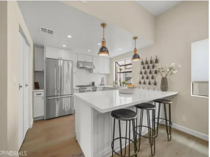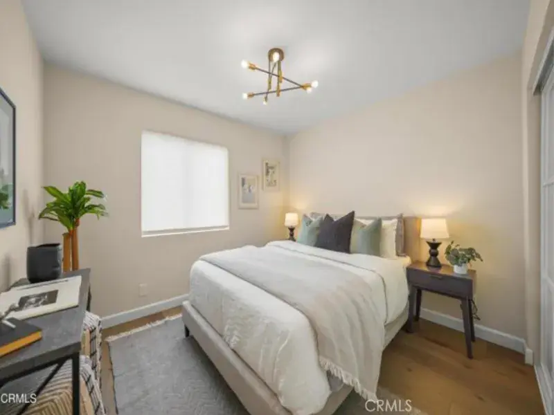 restaurants and grocery stores (such as Erewhon, Target and Trader Joe’s). Enter through the private patio into the spacious living room, with ten-foot ceilings, recessed lighting and beautiful wood flooring. There is a spacious dining area off the newly renovated kitchen. The kitchen has stainless steel appliances, stone countertops with a breakfast bar and lots of storage. There is also a convenient laundry closet, complete with a new stackable washer and dryer. A powder room completes the main level of the home. On the second level, the primary suite has charming tree top views and a three-quarter bathroom with a skylight. There is a second bedroom off the hallway, plus an office/den and an additional full bath also with a skylight. Multiple built-in cabinets are also located in the upstairs hallway. Downstairs is a large, private attached two-car garage and there is a lovely pool in the complex. *Please note that the property is staged in the photos but the townhouse is being leased unfurnished.