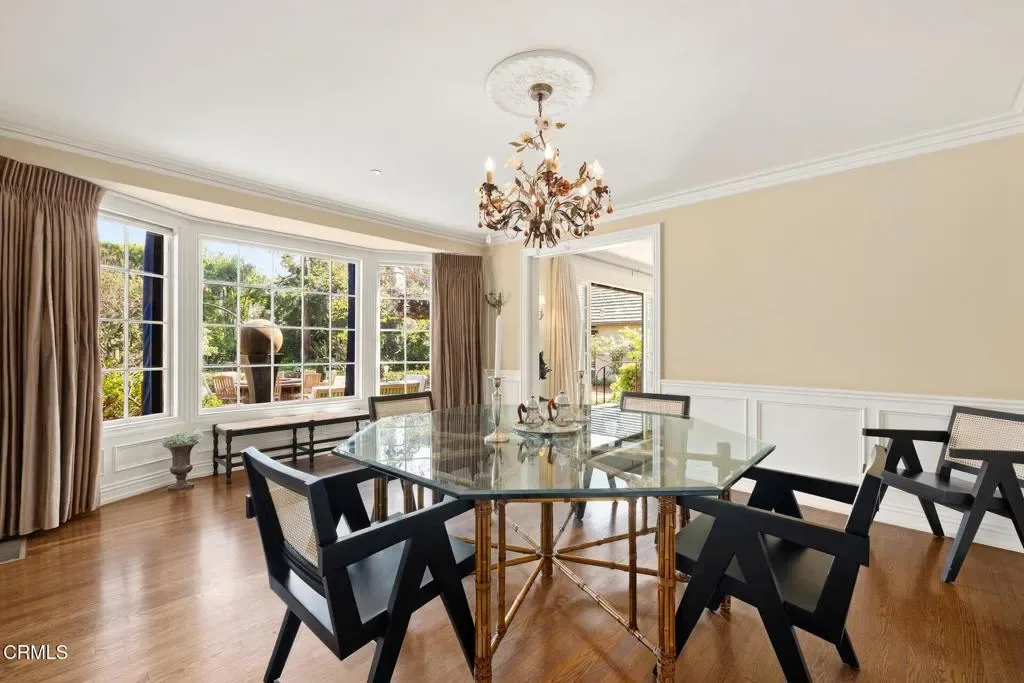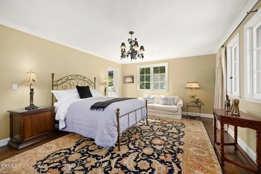 A distinguished four-bedroom, five bath, single story French Normandy residence, thoughtfully renovated and meticulously maintained, set on more than 29,000 square feet of parklike grounds in Pasadena’s coveted Caltech Huntington Library district. Designed for easy living, the light filled floor plan offers seamless indoor-outdoor flow, ideal for daily living as well as gracious entertaining.The grand living room opens through sliding French doors to a large brick patio and an extraordinary, award-winning garden beyond. Anchored at the eastern edge of the property by a magnificent redwood, the grounds unfold across a sparkling pool and expansive lawn, creating a serene and private outdoor setting that embodies the best of the California lifestyle.The chef’s kitchen features stone countertops, custom furniture grade illuminated cabinetry, and professional stainless-steel appliances by Sub Zero, Miele, Wolf, and Bosch. A cozy family room, with beamed ceiling, built in bar, and wood burning fireplace, opens to both the kitchen and the outdoor brick patio. A well-appointed butler’s pantry, with Sub Zero beverage refrigerator, freezer, and abundant built ins, sits just beyond the kitchen and adjacent to a versatile fourth bedroom, office, or gym with a three-quarter bath and laundry.A handsome library with its own fireplace provides a quiet retreat and thoughtfully separates the public living spaces from the homes two private bedroom wings. The primary suite is a true sanctuary, introduced by a vestibule entry and centered around a generous bedroom with lounging area and fireplace. Two luxurious baths feature stone counters, expansive showers, custom cabinetry, and bespoke California Closets; one bath includes a soaking tub with French doors that open to a private secret garden. The secondary wing features two spacious en suite bedrooms, each enjoying abundant natural light and generous walk-in dressing closets.In addition to the front-of-house circular driveway, there is a recently constructed 680-square-foot detached garage with a ceiling height that can accommodate up to six vehicles. An attached 163-square-foot storage, playroom, or bonus space complements the building. Gated and fenced, the property offers exceptional comfort and privacy.