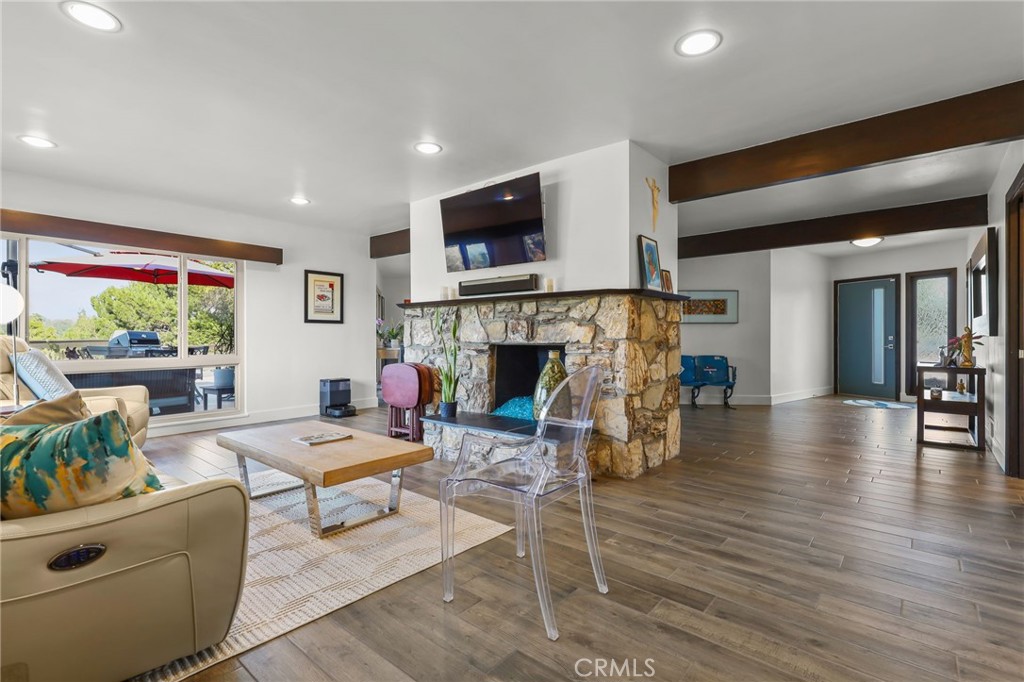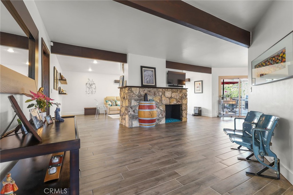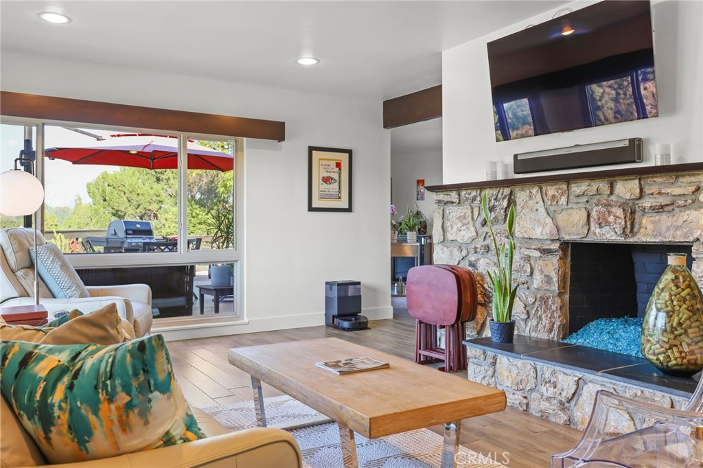 From the moment you arrive, the new front door and welcoming landscaping enhance the mid-century tone of the property. Inside, new porcelain flooring with upgraded baseboards flows through the entire home, complemented by upgraded interior doors. Two fireplaces, dressed with designer glass rock, bring warmth and character to the main living spaces, and dual pane windows flood the home with natural light throughout.